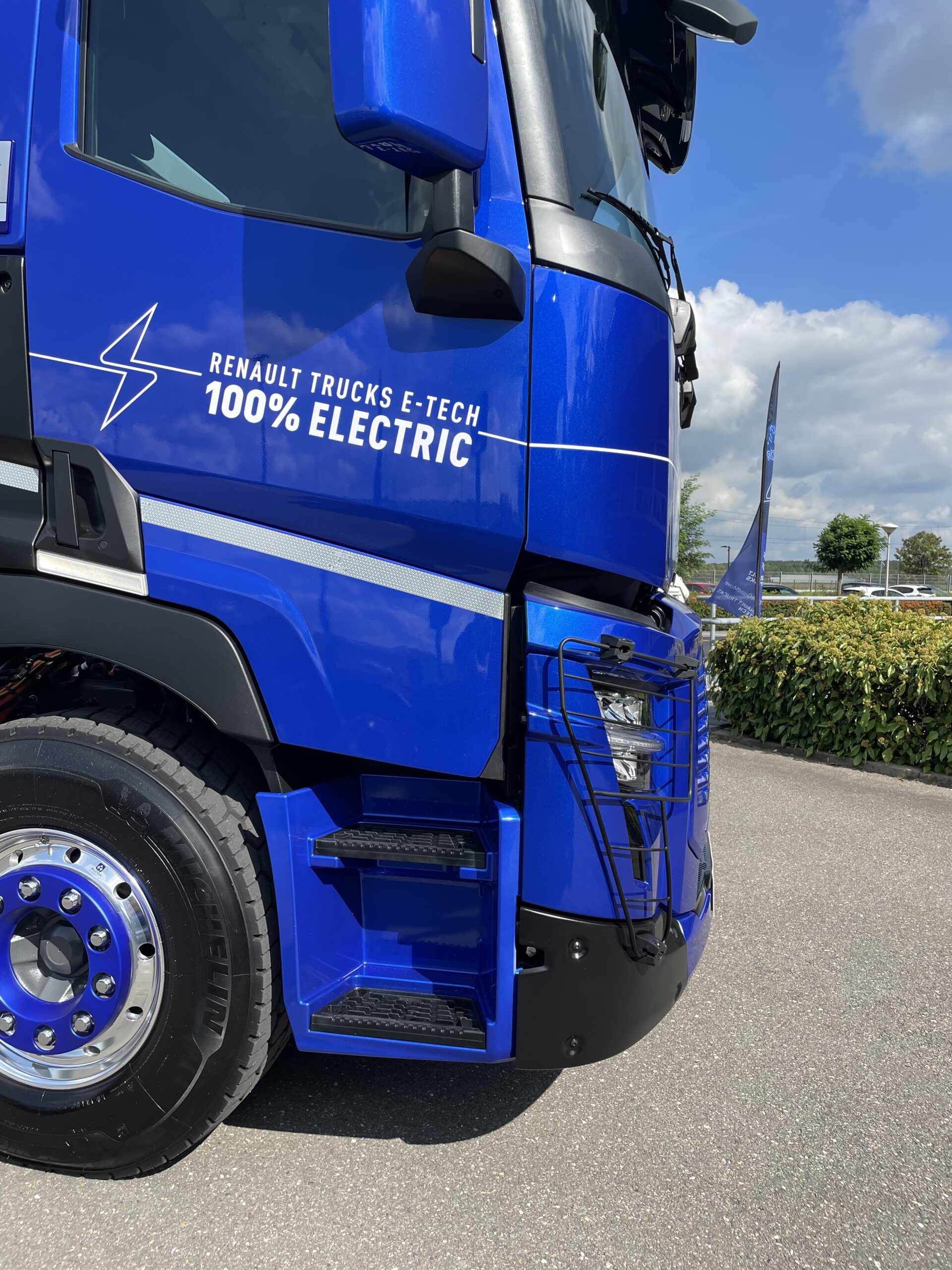 De cabine van de E-Tech heeft ook meteen een facelift gekregen. Zo is het nieuwe Renaultlogo zichtbaar op diverse plaatsen en heeft men het kenmerkende type-aanduidingsplaatje op de zijkant een opfrisbeurt gegeven. De grootste wijziging treffen we echter aan de voorkant van de cabine aan. Door gebruik te maken van de nieuwe Europese richtlijn waarbij je de cabine mag vergroten mits het bijdraagt aan de efficiency van het voertuig heeft men de cabine voorzien van een ‘neusje’. Vanaf de bovenzijde van de grill naar beneden is het front met 11,5 cm gegroeid. Vanaf de zijkant is dit goed te zien. Het geeft het geheel een ‘dikker’ aanzicht en verbetert de aerodynamica. Mede dankszij de fraaie blauwe kleur staan er een lekker smoelende auto.