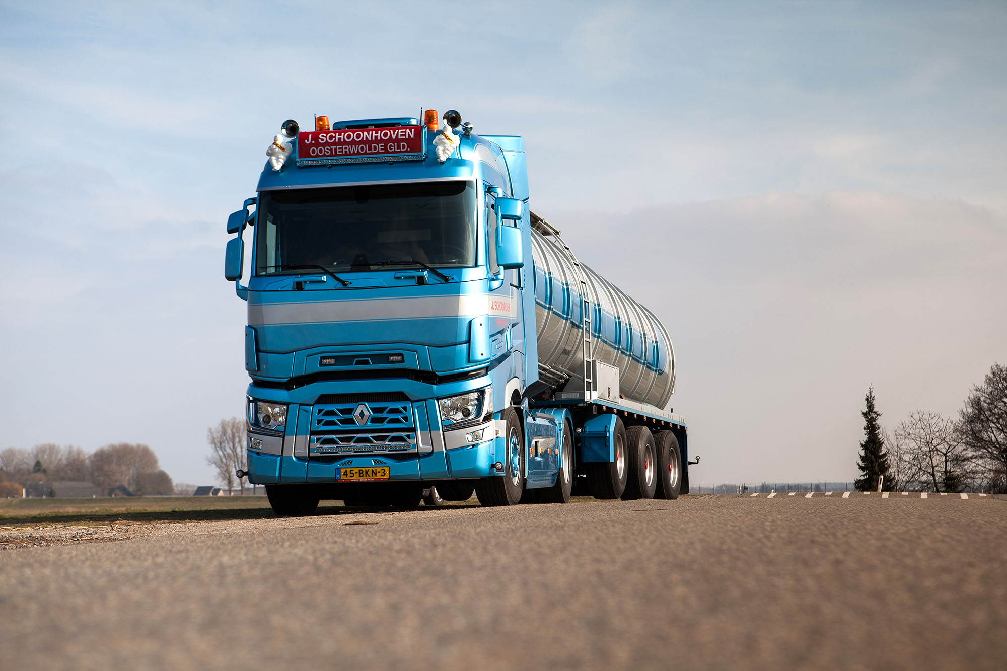 Om het maximale brutogewicht van 50 ton binnen Nederland volledig te kunnen benutten, heeft Schoonhoven de Renault Trucks T laten uitrusten met een 9-tons vooras en schuifschotel. “Bij binnenlands tanktransport van vloeibare meststoffen zetten we de schotel naar voren om het gewicht van de beladen tankoplegger optimaal over de beide assen te verdelen”, legt directeur-eigenaar Jarno Schoonhoven uit. Daarnaast wordt het voertuig met een walking-floortrailer ingezet voor de export van vaste meststoffen en losgestorte agrarische bulkgoederen.