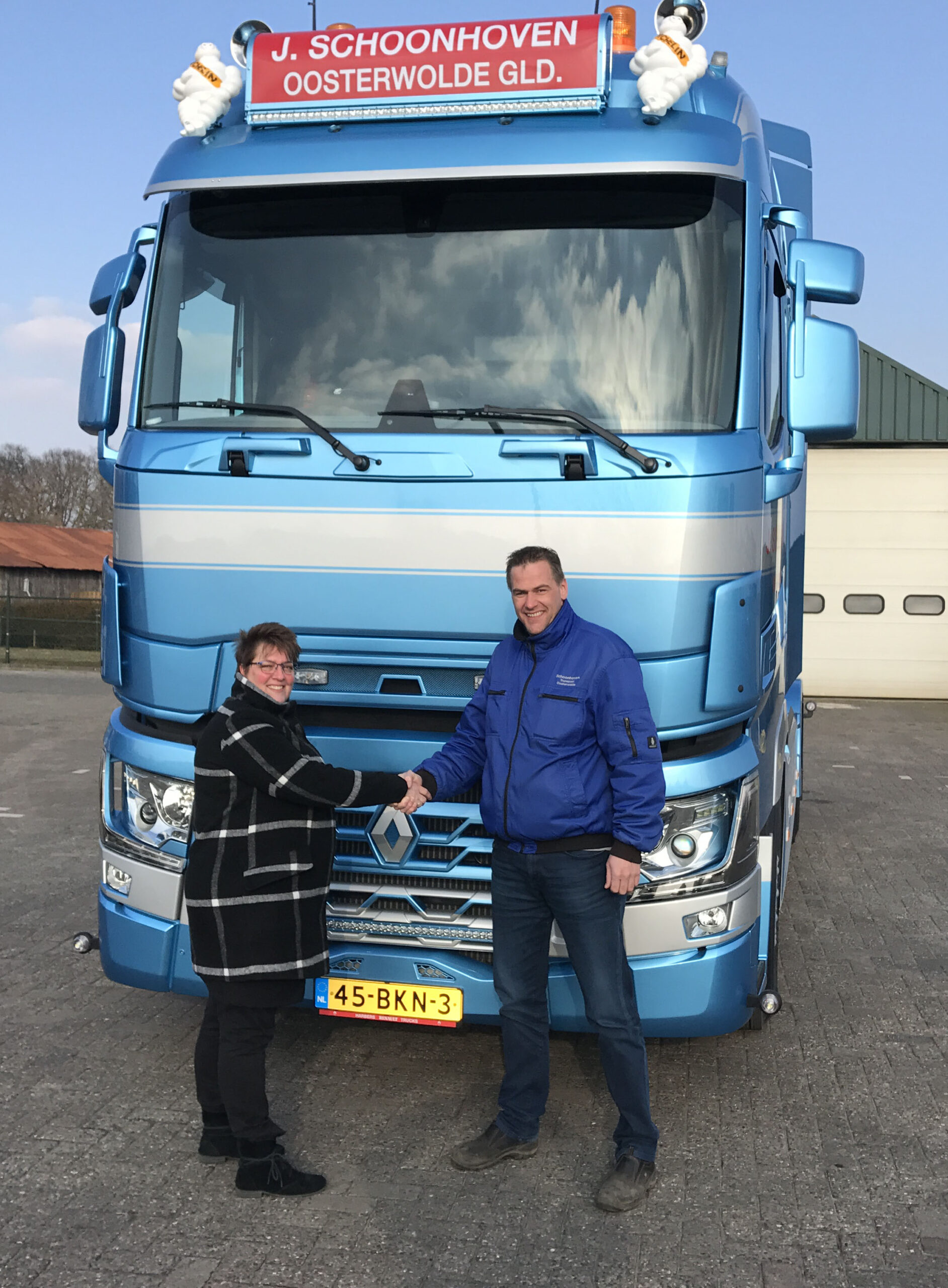 De aflevering bij Schoonhoven Transport was een memorabel moment: de eerste Renault Trucks T voor het transportbedrijf is tevens de laatste truck die is verkocht door Eddy van der Waerdt. De Renault Trucks-verkoper overleed vorig jaar na een kort ziekbed. Uit zijn naam overhandigde zijn vrouw de sleutels van zijn laatst verkochte truck aan de nieuwe eigenaar.