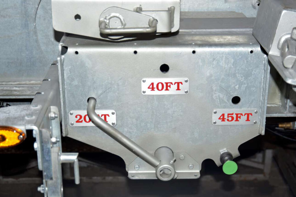 Ook het zeer eenvoudig verschuiven van een 32 ton zware 20 voet container tussen de 20ft centrale rijpositie en de 20ft achter laad/los positie, gaat zonder enig probleem tijdens de demonstratie en dit met zeer weinig kracht van de trekker. De extra versterkte nek constructie blijkt zelfs bestand tegen het uitschuiven naar de 45 voet positie met die zware 20 voeter in centrale positie. De doorbuiging van de nek blijft daarbij verwaarloosbaar. De chassis uit de 900 serie zijn star uitgevoerd met een uitschuifbare achterkader voor 40- en 45 voet posities. Het schuifsysteem bij dit type werkt pneumatisch met een sterke cilinder.
