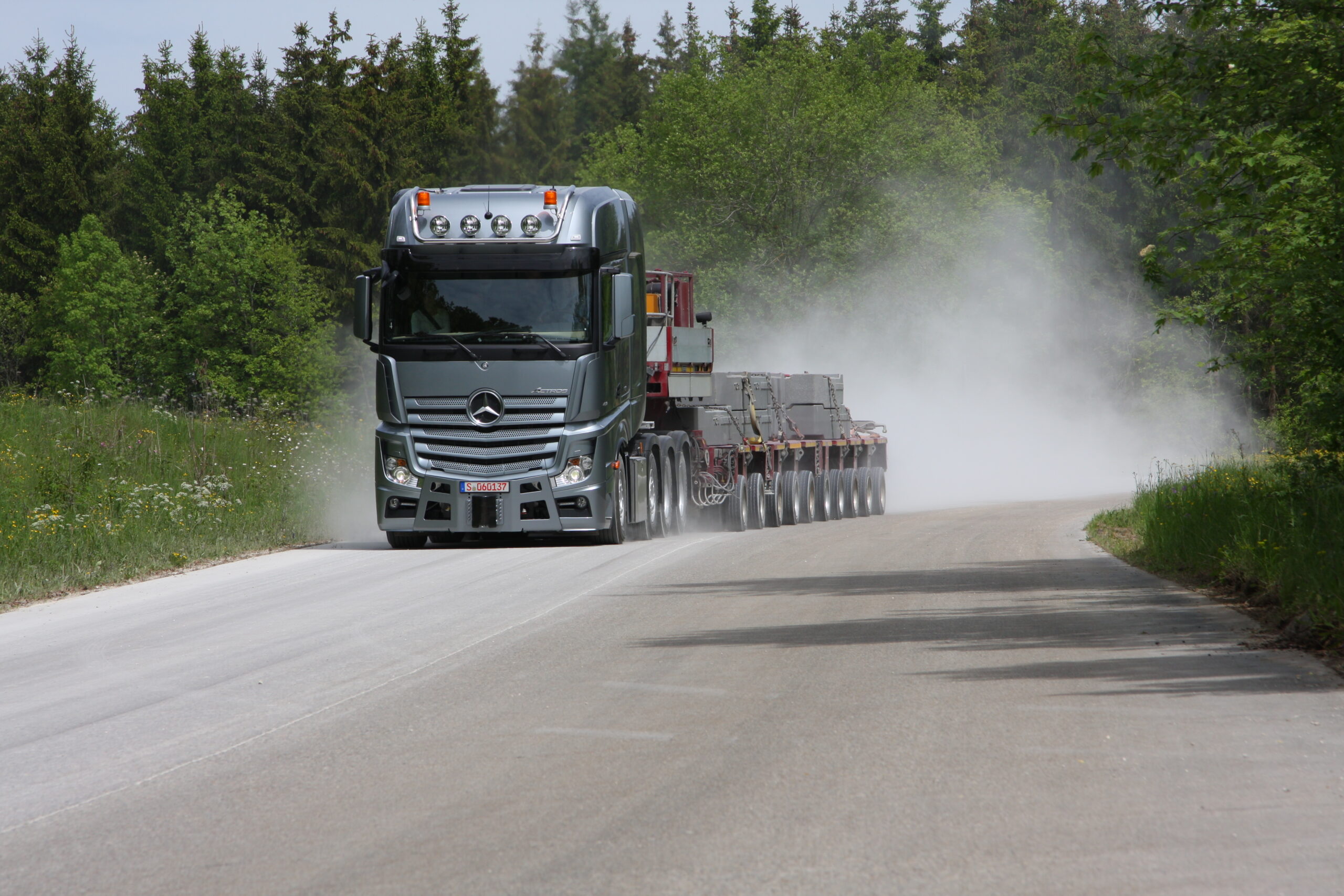 De nieuwe Euro 6 Schwerlasttransporter (SLT) van Mercedes-Benz is er voor het echt zware werk, voor treingewichten tot 250 ton, en wordt als Actros en als Arocs gebouwd. Eind mei 2014 stelt Mercedes-Benz ons in de gelegenheid een ochtend lang met de nieuwe SLT te rijden en manoeuvreren. Met gewichtige bouwkranen en ballastgewichten op lange en brede Goldhofer en Scheuerle diepladers met flinke aantallen aslijnen, heeft Mercedes de werkelijkheid van het zwaartransport prima nagebootst.