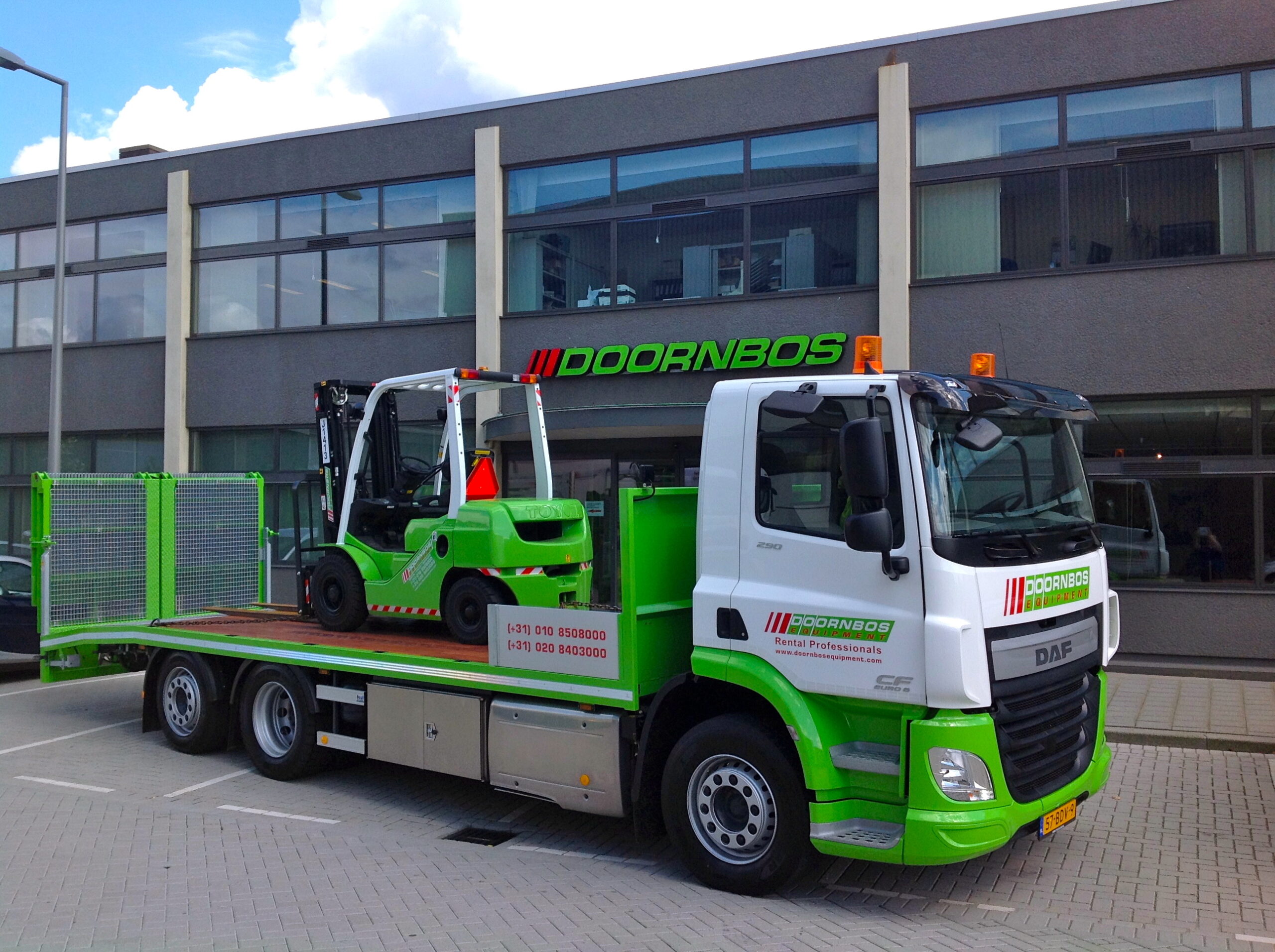 Dit maakt de CF geschikt voor het vele werk dat Doornbos (ruim 80%) verricht in de binnensteden. De geavanceerde cabine is uitgerust met een extra groot raam in de achterzijde, een geautomatiseerde AS Tronic versnellingsbak, de DAF Driver Performance Assistant (DPA) en een luxe chauffeursstoel. Comfort, veiligheid, het eenvoudig in- en uitstappen en het nieuwe dashboard volledig rond de chauffeur ontworpen bieden de ideale werkomgeving. Booi Karrosserieën in Zwijndrecht leverde de oprijwagen met dubbele hydraulische oprijbanen met aanrijhoek van 5 graden.