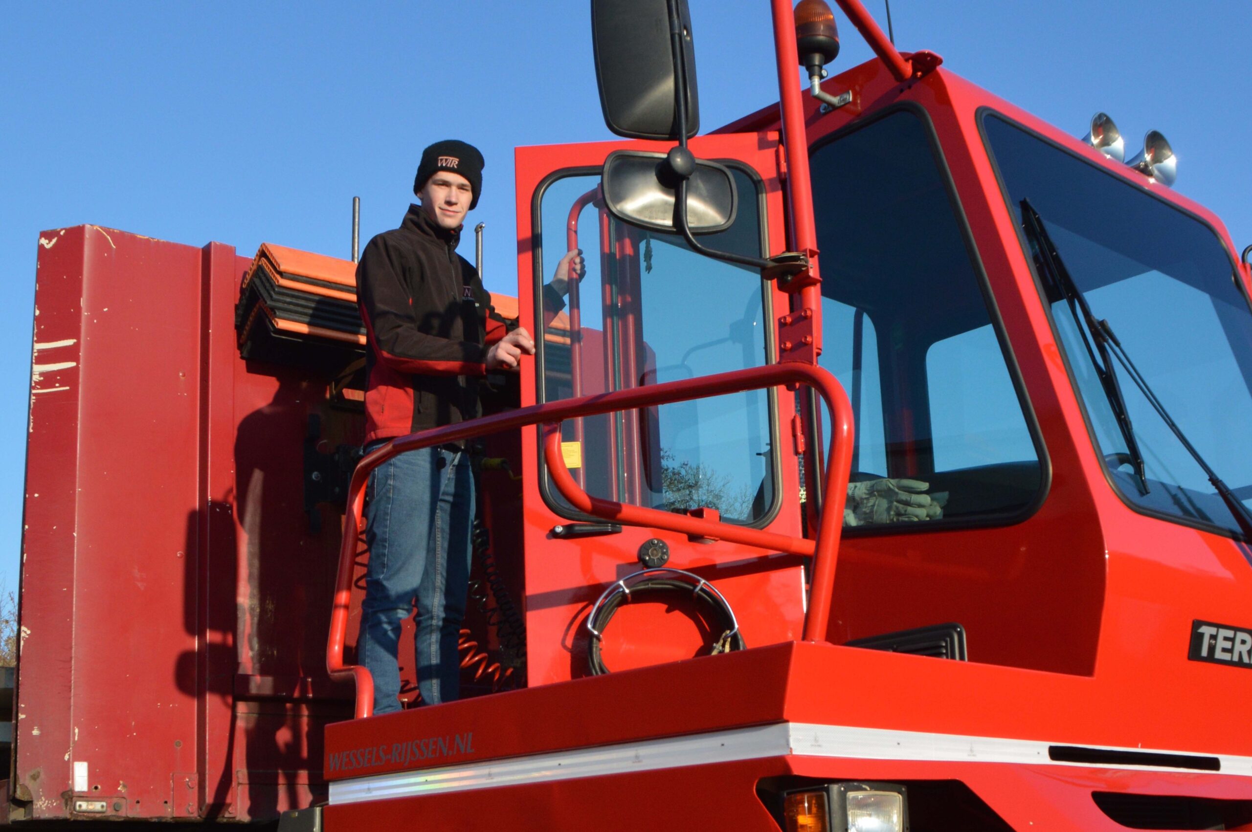 “Ik loop al sinds mijn dertiende bij Wessels rond,” vertelt hij, “want mijn vader is hier ook chauffeur. Op mijn vijftiende ben ik hier wasjongen geworden. Toen ze hoorden dat ik de BOL-opleiding ging doen, heeft het bedrijf mij aangeboden mijn trekkerrijbewijs te betalen als ik hier drie dagen in de week zou komen werken als chauffeur op de terminaltrekker. Natuurlijk heb ik ja gezegd: dat is toch helemaal super!”