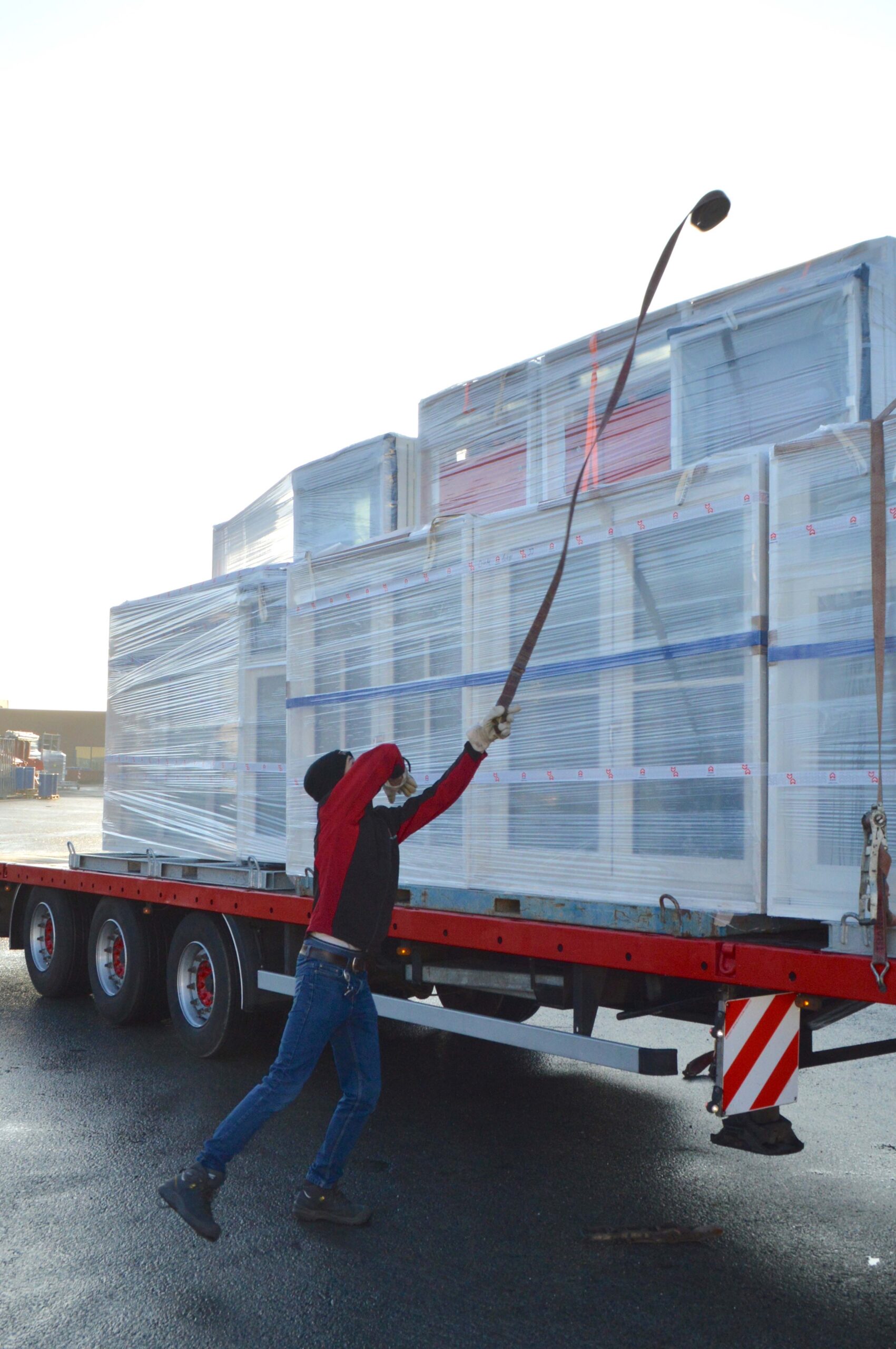 - Een van zijn werkzaamheden is spanbanden aanbrengen op de geladen trailers.