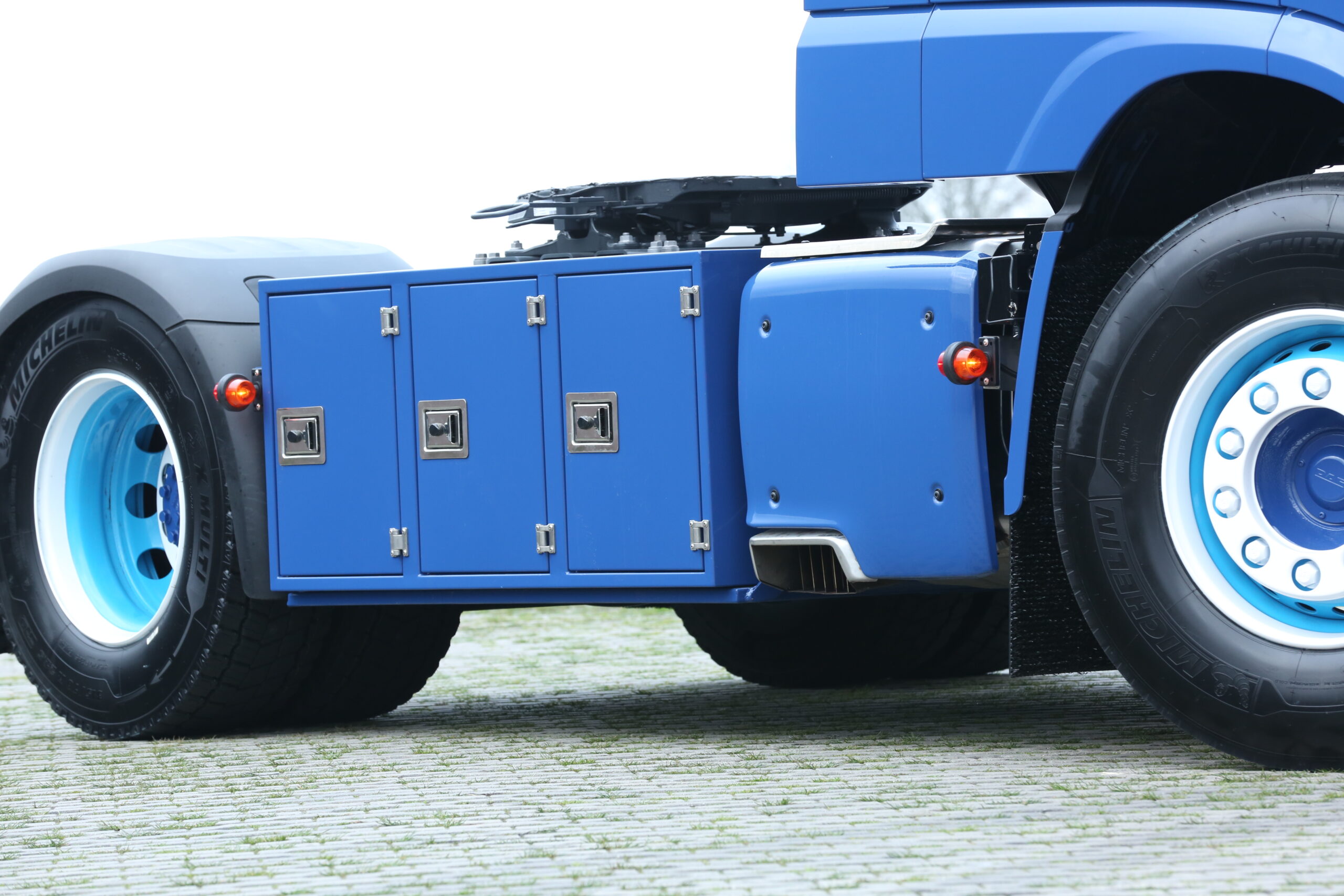Naast de zeer bekende bedrijfskleuren werd de DAF door Sjaak Kentie ook voorzien van een grote kist aan het chassis naast de demper. Een lange zonneklep en onderspoiler met 4 bloklampen erin maken het voor chauffeur Kevin Tulliken helemaal af. Hij kan dan ook niet wachten om met zijn nieuwe DAF naar Duitsland te gaan om de zeilentrailer met groupage lading leeg te rijden.