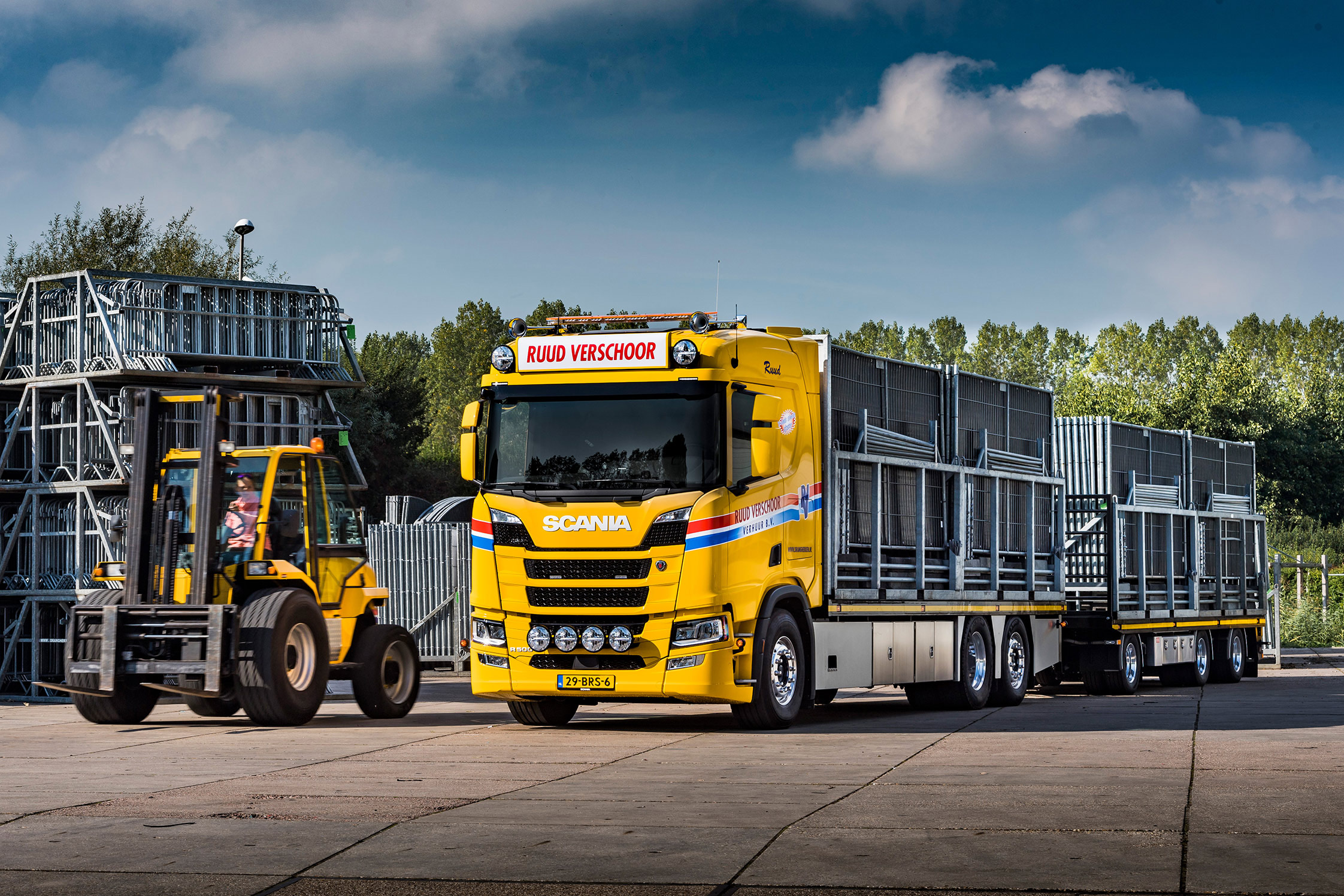 Ruud Verschoor Verhuur B.V. uit Hellevoetsluis nam onlangs voor het eerst een Scania R500 6×2 bakwagen met een open laadbak en een hefbare en gestuurde naloopas in gebruik. ‘’s Lands slimste afzetter’, zoals er trots op de website staat, is een grote verhuurder van ondermeer dranghekken, barriers en andere evenementen infra.