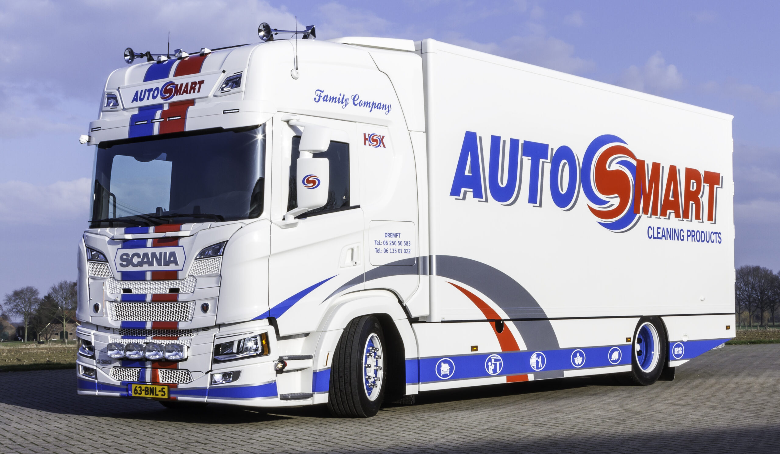 “Met dit nieuwe vlaggenschip kunnen we onze klanten nog beter van dienst zijn. Klanten kunnen letterlijk voor de deur hun inkopen doen. Voorin de laadbak zijn zes 220 liter tanks gebouwd. Vanuit daar worden, uiteraard passend binnen wet- en regelgeving, shampoos en allesreinigers overgepompt”, zegt Hans Kooij. “Autosmart noemt dat het barrel for life principe; het scheelt verpakkingsmateriaal en gesleep met volle en lege jerrycans en levert daarmee een positieve bijdrage aan de milieudoelstellingen,” verklaart Hans.