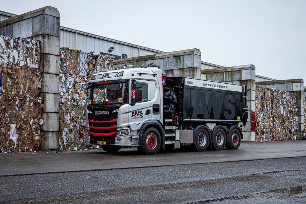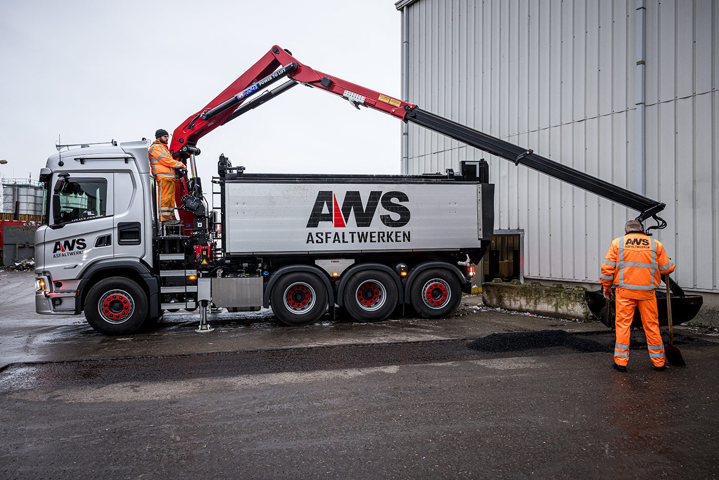 Rob heeft samen met chauffeur Roy uitgebreid gepuzzeld om de auto zo optimaal mogelijk gespecificeerd te krijgen voor het werk. “We hebben bewust gekozen voor de dubbel geïsoleerde asfaltopbouw van Tibeg. Want de lading gaat er bij de asfaltmolen op 180⁰ Celsius in en moet zo lang mogelijk op temperatuur blijven. De kleppen worden elektrisch bediend, want we hebben maar één motor-PTO en de kraan en de hefinrichting van de bak zijn ook al hydraulisch. De achterklep van de bak is weer uitwisselbaar met een speciale versie waardoor je via dieplader ook machines in de bak kunt rijden. En verder hebben we alle ruimte aan het chassis optimaal benut voor extra opbergruimte.”