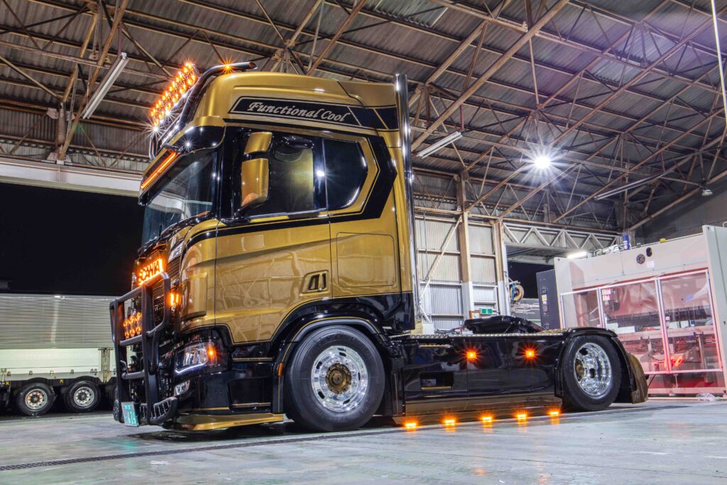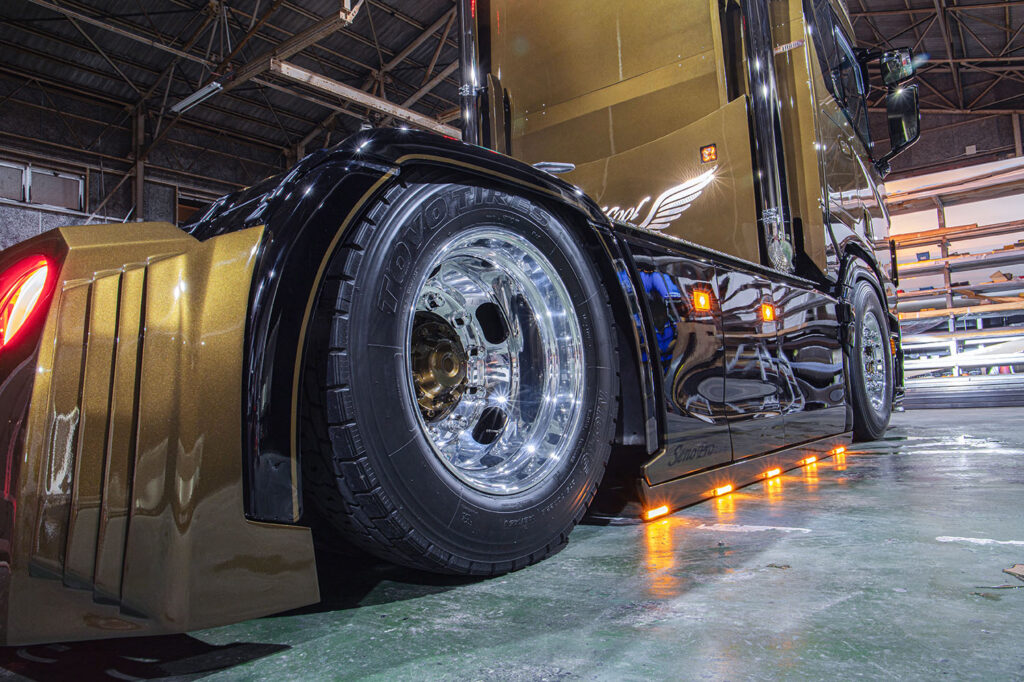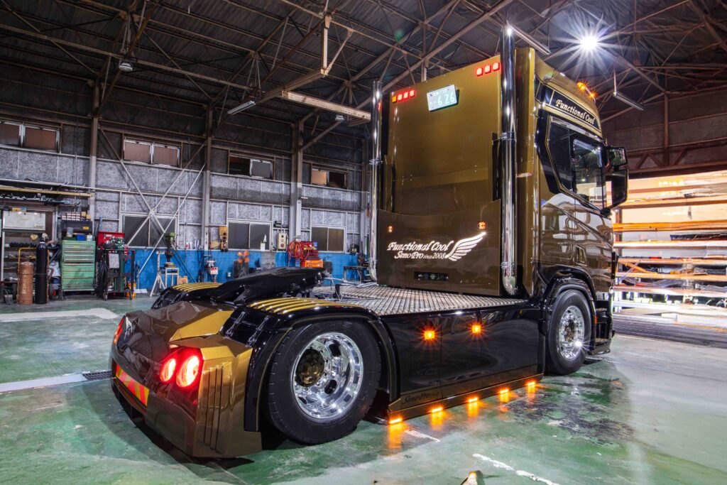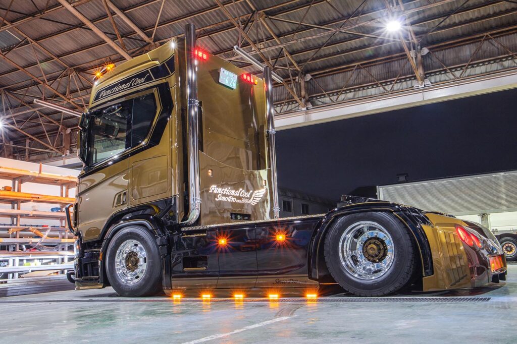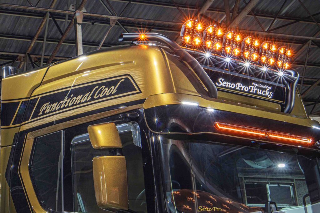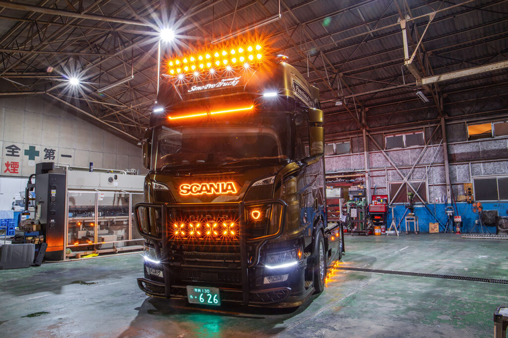 Het nieuwste wapenfeit is deze Scania 460R, welke van voor tot achter is aangepakt. Europese truckstyling staat in Japan hoog aangeschreven, een reden waarom de Japanse truckbouwer ieder jaar onder andere het Profile Truckstar Festival bezoekt. Hier is ook het contact gelegd met Tralert, welke inmiddels als vaste partner het verlichtingspakket heeft samengesteld.
