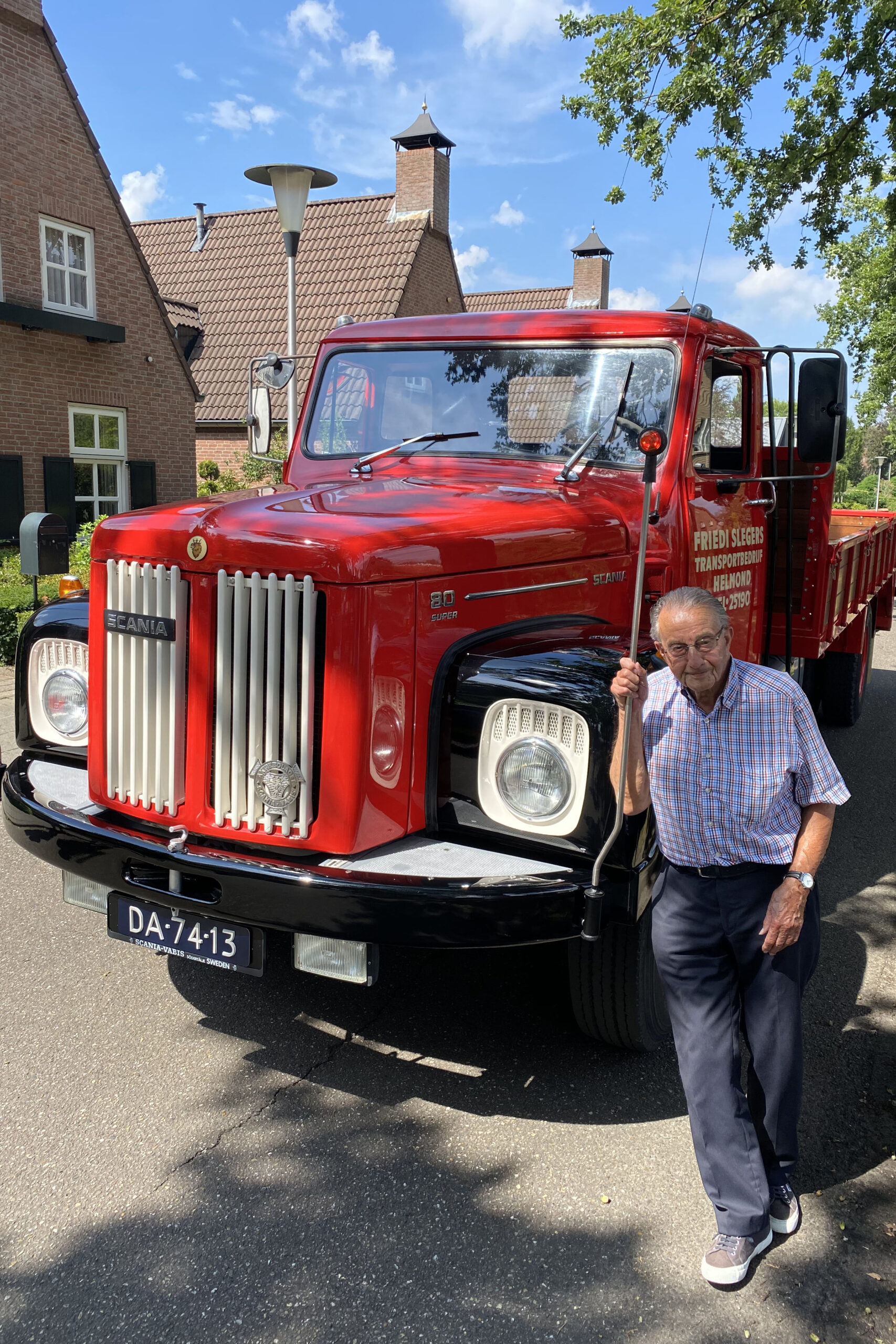 De familie van de 91-jarige Friedi Slegers bedacht wel een heel gaaf cadeau voor de oud-eigenaar van het gelijknamige transportbedrijf. Er werd een Scania L80 uit 1972 gerestaureerd en in de huisstijl van weleer gespoten.
