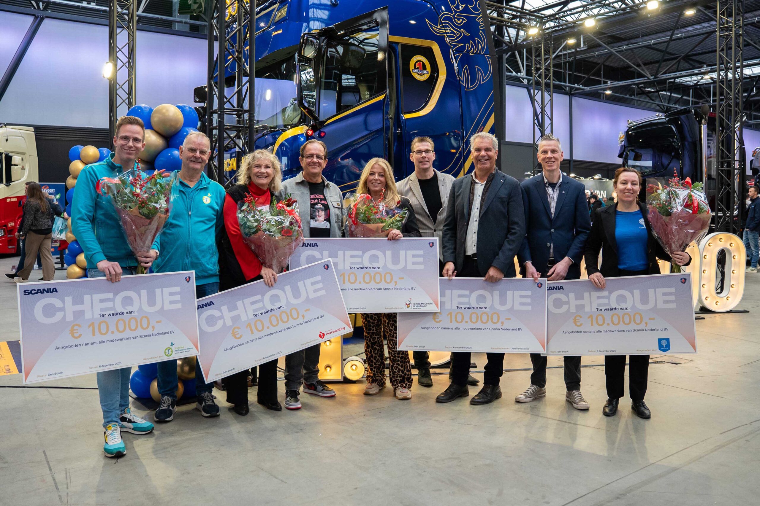 Vijf goede doelen hebben elk een donatie van € 10.000,- namens alle medewerkers en de directie van Scania Nederland gekregen. De uitreiking van de cheques vond plaats tijdens het Mega Trucks Festival in Den Bosch.