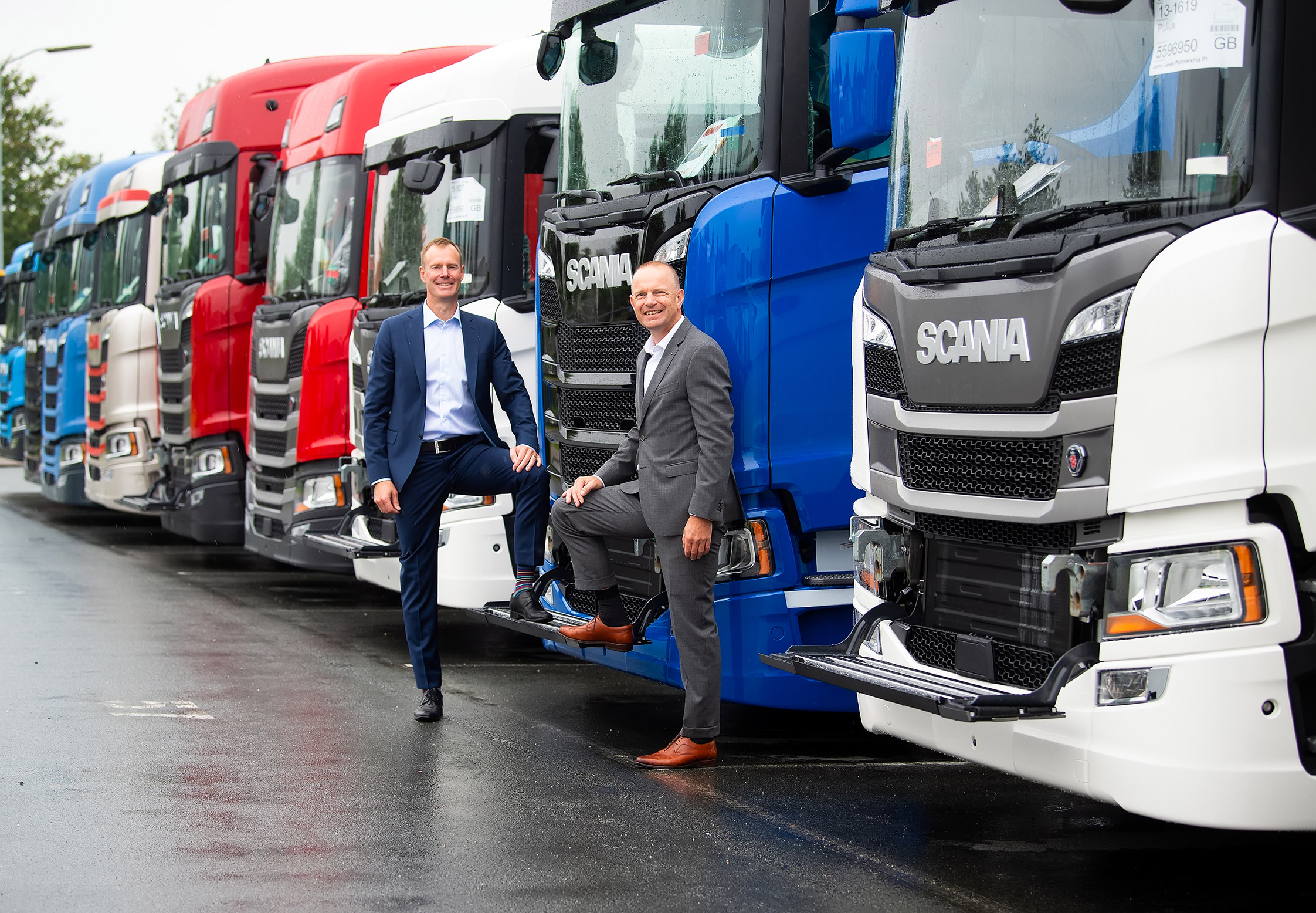 Janko van der Baan (L) en Johan Uhlin voor Defensie-trucks die de komende jaren door Scania worden gebouwd.