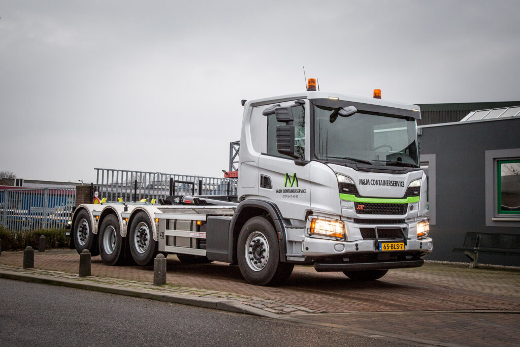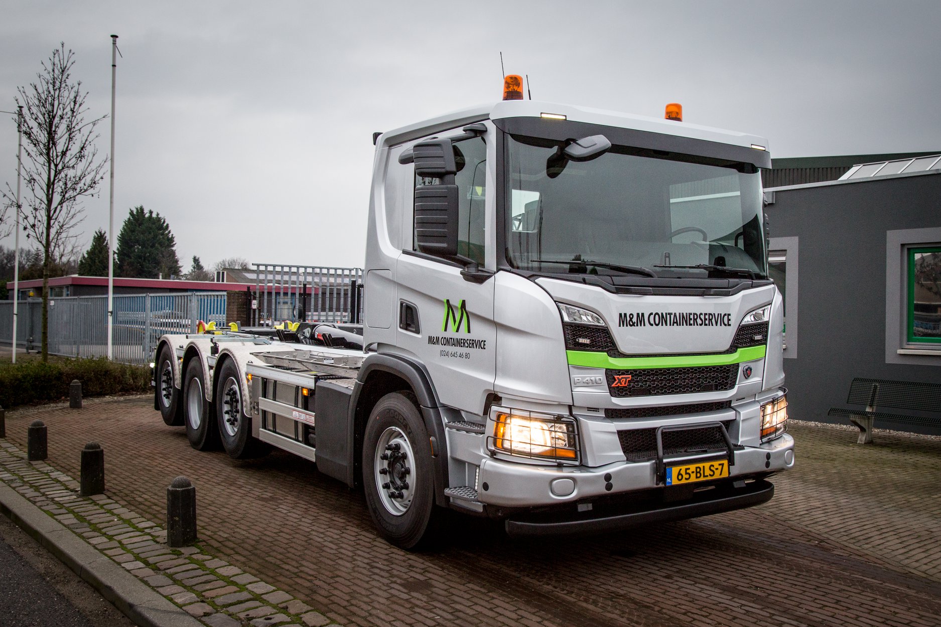 M&M Containerservice in Wijchen nam recent een P410 8×2 in XT-uitvoering met gestuurde en hefbare vóór- en naloopas in gebruik. Een bewuste keuze want dit is de derde Scania die het jonge bedrijf in korte tijd kocht. De truck heeft een Hiab haakarm installatie waarmee grote containerbakken op- en afgezet kunnen worden.