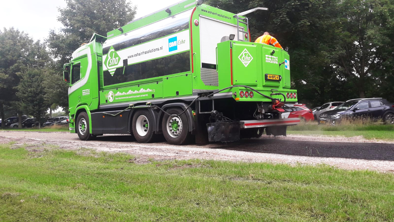 In de wegenbouw worden bitumenemulsies gebruikt als slijtlaag in combinatie met split of als hechtlaag onder nieuw asfalt. Rudolf Aalders: “Wij deden het werk tot nu toe met een 22 jaar oude Scania 113 Streamline sproeiwagen die een breedte van maximaal 5.70 meter kon bestrijken. Daarmee konden we een strook van vier kilometer in drie kwartier insproeien. Maar we wilden dat beter. Toen zijn we samen met ESHA en Tjalma gaan ontwikkelen. Deze truck heeft twee spuitarmen die 7,50 meter in één keer kunnen bestrijken. Dat is niet één maar twee rijstroken en dus dubbel zo snel en lekker efficiënt.”