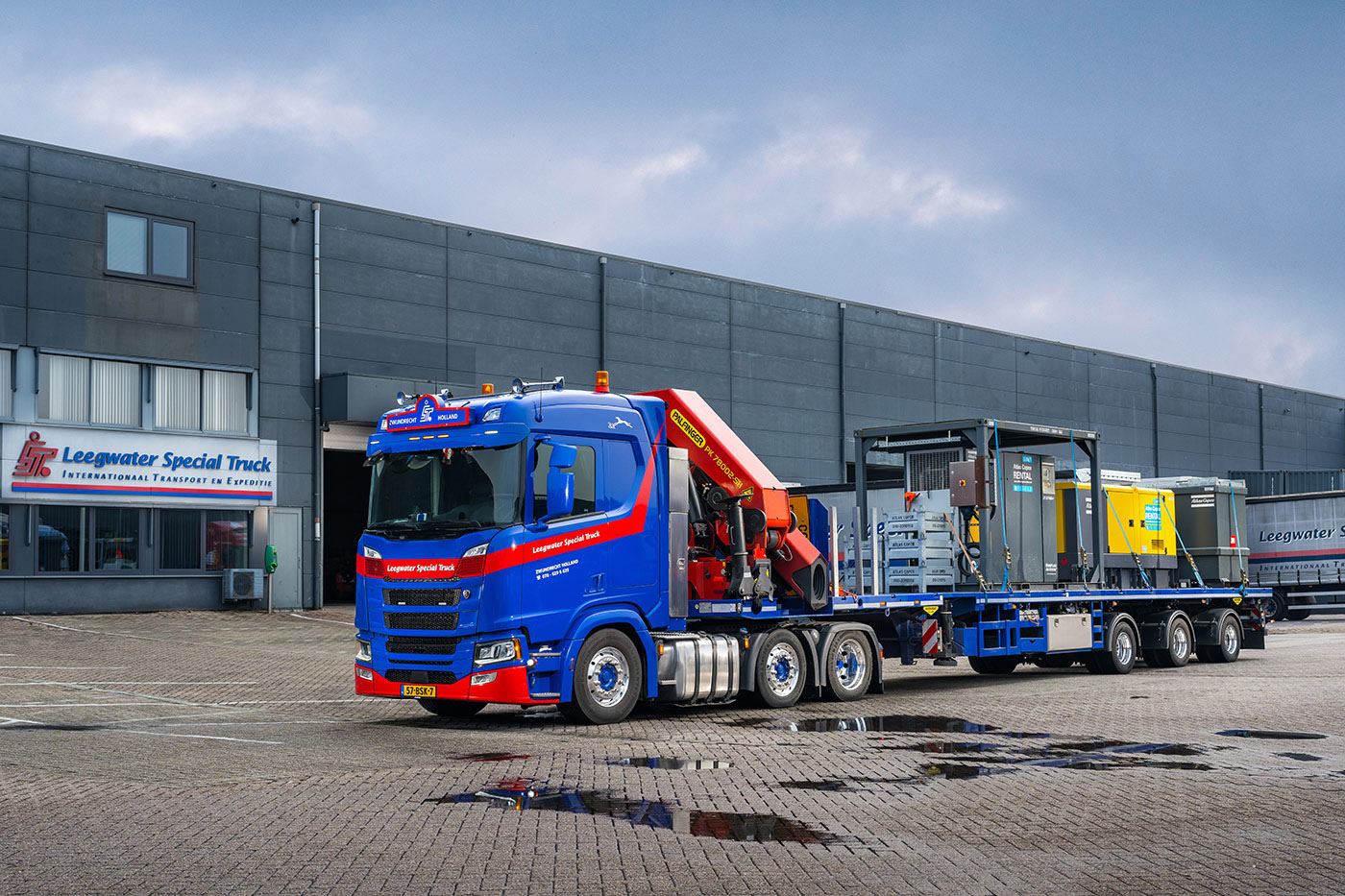 Die geringe hoogte heeft Leegwater nodig omdat er achter de Scania een nieuwe volkomen vlakke drieassige uitschuifbare trailer gekoppeld wordt. “Het bijzondere daaraan is dat die aan de voorzijde is voorzien van een Palfinger 78 ton/m kraan. Deze schuift zeven keer uit en kan daarmee 18 meter vér reiken. Dat is een combinatie die verder in Nederland nog nergens rijdt, dat is een gok, maar wij geloven erin,” geeft Sander uitleg.