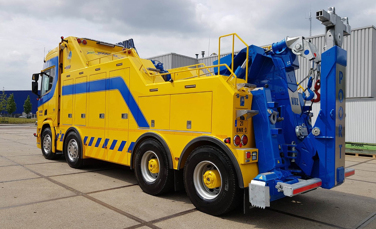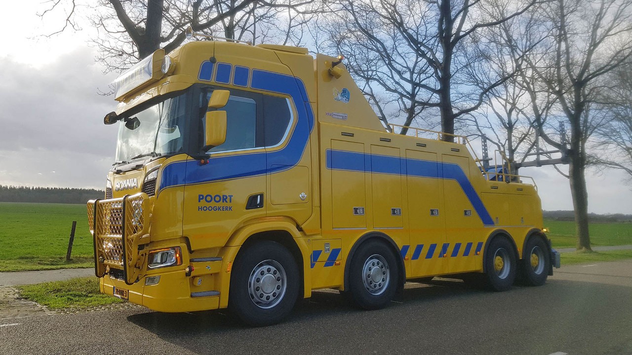 “Bij een zware bergingstruck, moet je voldoende vermogen hebben. Vandaar dat wij voor onze nieuwe Scania 8×4 wrecker voor een 650 pk V8 kiezen,” meent Hendrik Poort van het gelijknamige bergingsbedrijf in het Groningse Hoogkerk.