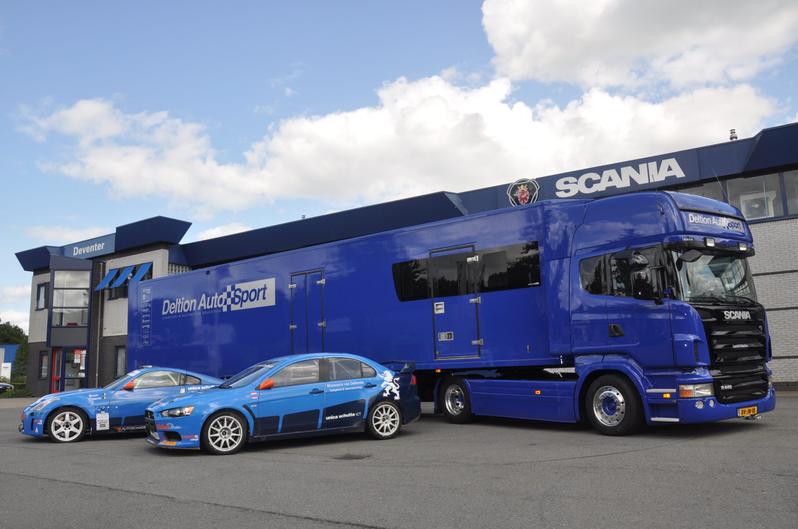 De truck is voor het raceteam van het Deltion College uit Zwolle. De R440 werd afgeleverd door Scania Deventer, is opnieuw gespoten, voorzien van nieuw type side skirts en mooie glimmende Alcoa’s met nieuwe banden.