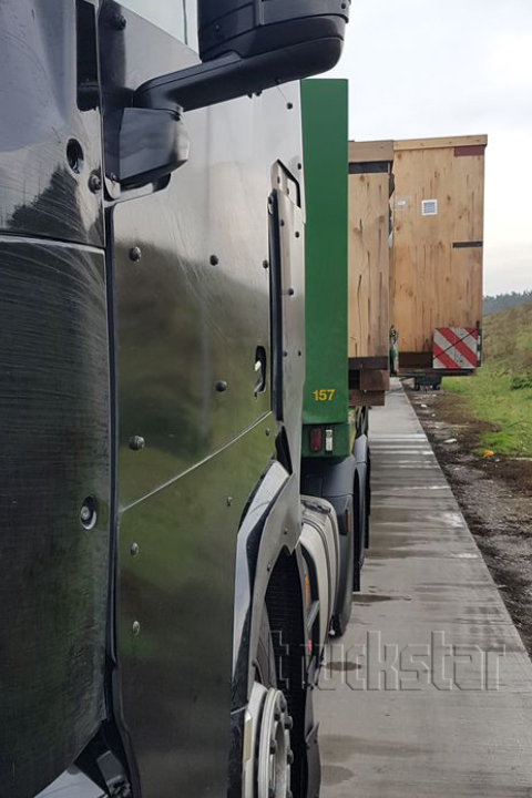 Als we verder kijken naar de buitenkant van de trucks lijkt het te gaan om diverse cabinevarianten. Het vermoeden ontstaat dat de nieuweling niet alleen de XF gaat opvolgen, maar ook de CF. Hoogstwaarschijnlijk gaat DAF dus over op een modulair bouwsysteem, zoals we ook bij andere fabrikanten als Scania en Volvo zien. Door alle camouflage en de strikte zwijgplicht bij de medewerkers van de transportbedrijven die aan de veldtesten meedoen, weten we nog weinig over het definitieve uiterlijk. Een andere Truckstar-lezer, Marco van de Lageweg, spotte deze veldtesttruck bij Autohof Aurag, vlakbij Neurenberg. Deze asconfiguratie, een 6×4, zagen we nog niet eerder, maar het is niet verrassend dat DAF ook deze test.