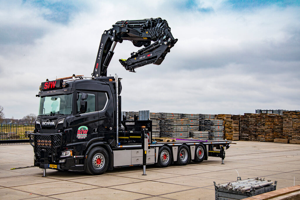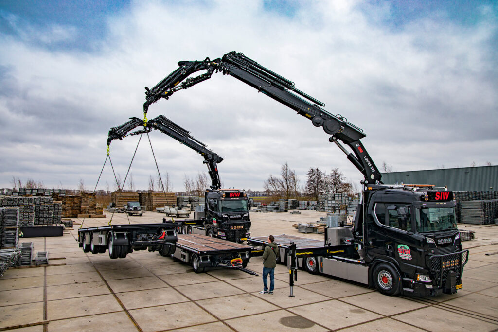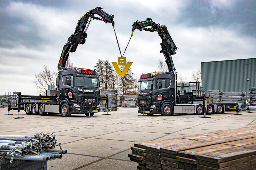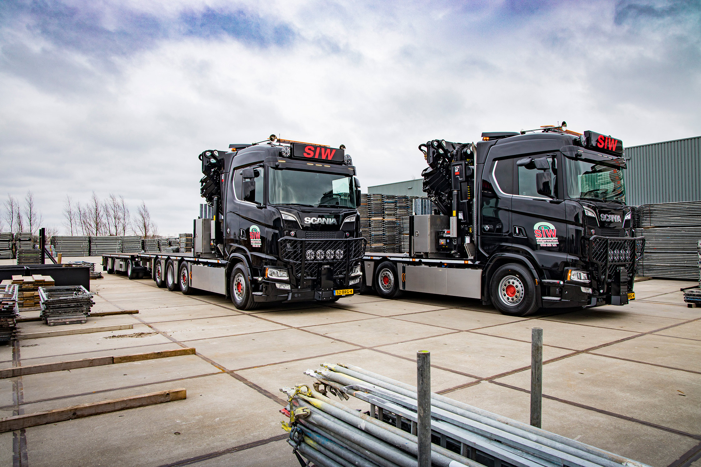 Steigerbouwbedrijf SIW uit Numansdorp heeft een compleet nieuw wagenpark. Eigenaar Ad van der Meer verving zijn beide trucks door twee nieuwe Scania 520S V8 bakwagens met een gestuurde voorloop- en naloopas en met daarop een vijf keer gestempelde Hiab 54 ton/m cabinekraan. Ook de bijbehorende schamelaanhangwagens zijn vervangen.