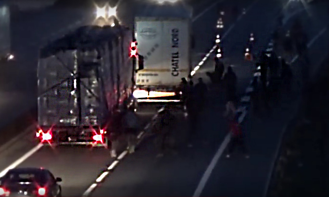 Als je even een paar minuutjes doorscrollt op onderstaande video, zie je dit duidelijk in beeld. Illegalen proberen trucks tot stilstand te dwingen met pillonnen en belagen de trucks vervolgens met geweld.