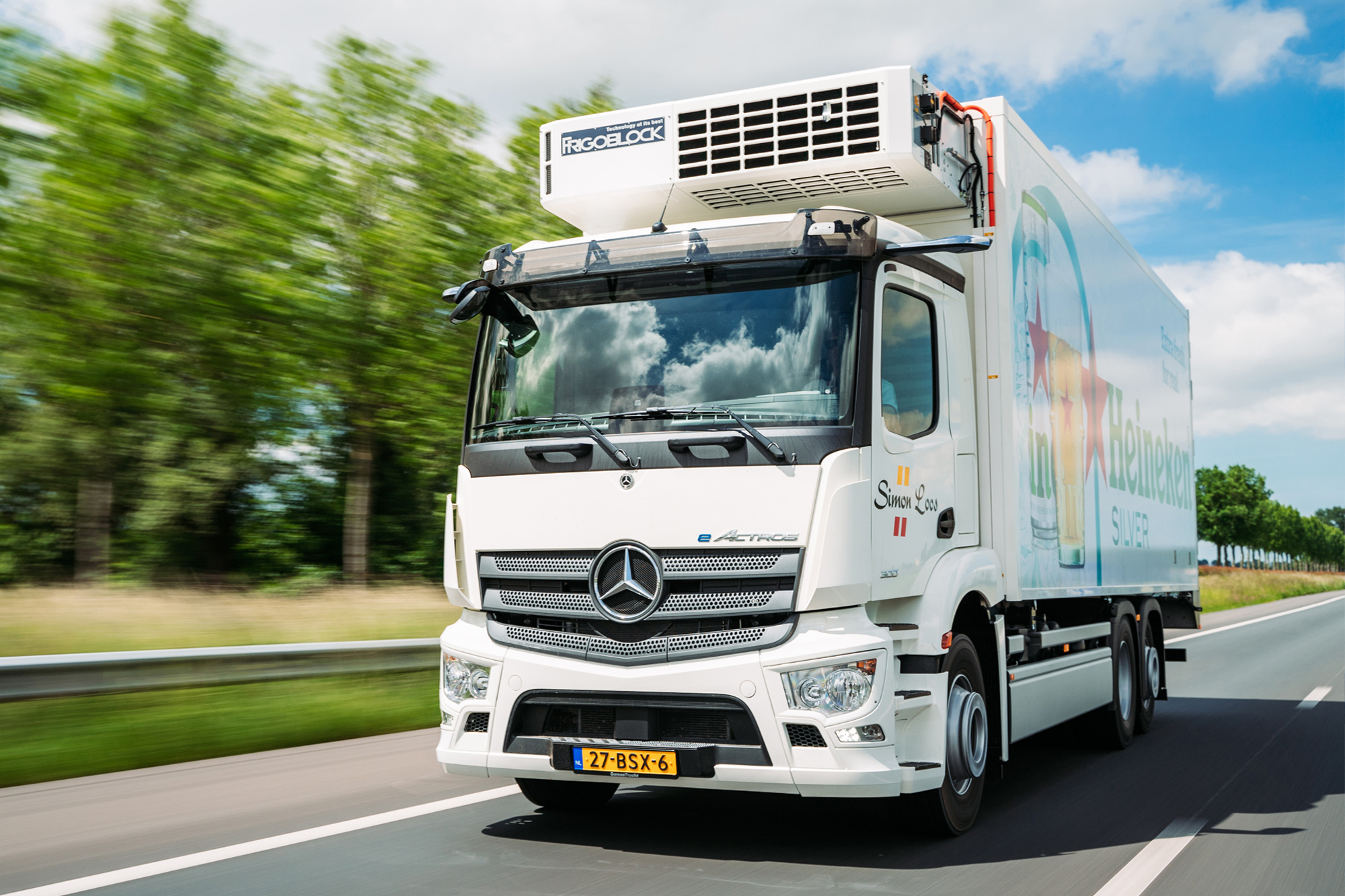 Elektrisch hoogstandje De 27-tons eActros is volledig elektrisch en daarmee emissievrij en muisstil. De truck heeft een 3-assig chassis met gestuurde naloopas. Met de batterijcapaciteit van 335 kWh is het mogelijk om ook met de gecombineerde diepvries en koelinzet onder alle omstandigheden een rijafstand van minstens 200 kilometer af te leggen. Tegelijkertijd verzorgt de batterij de voeding van de Frigoblock koelmachine.
