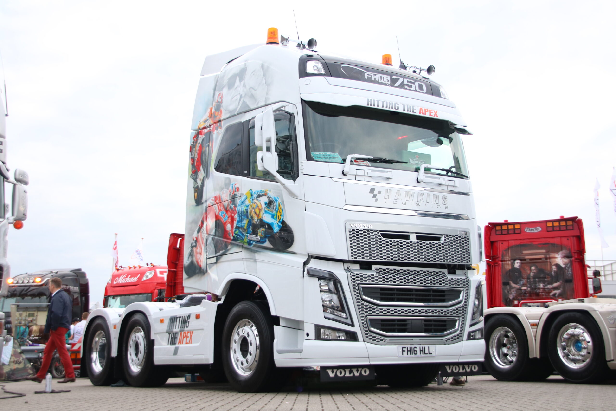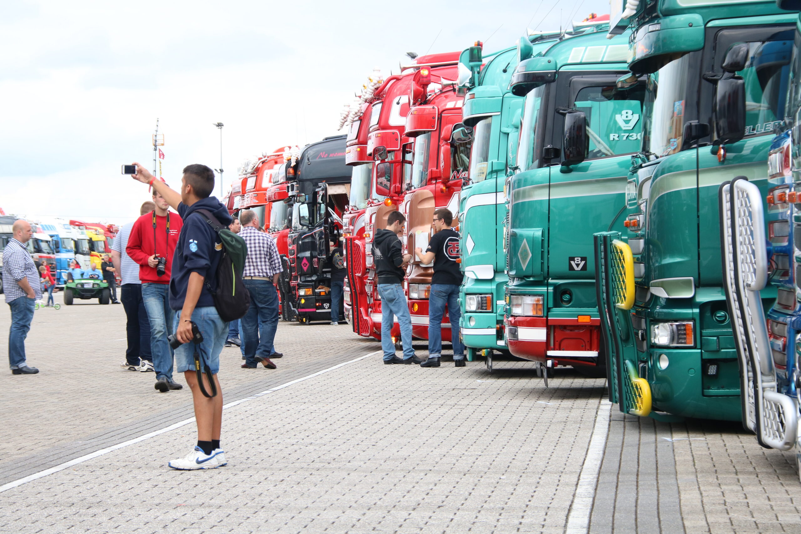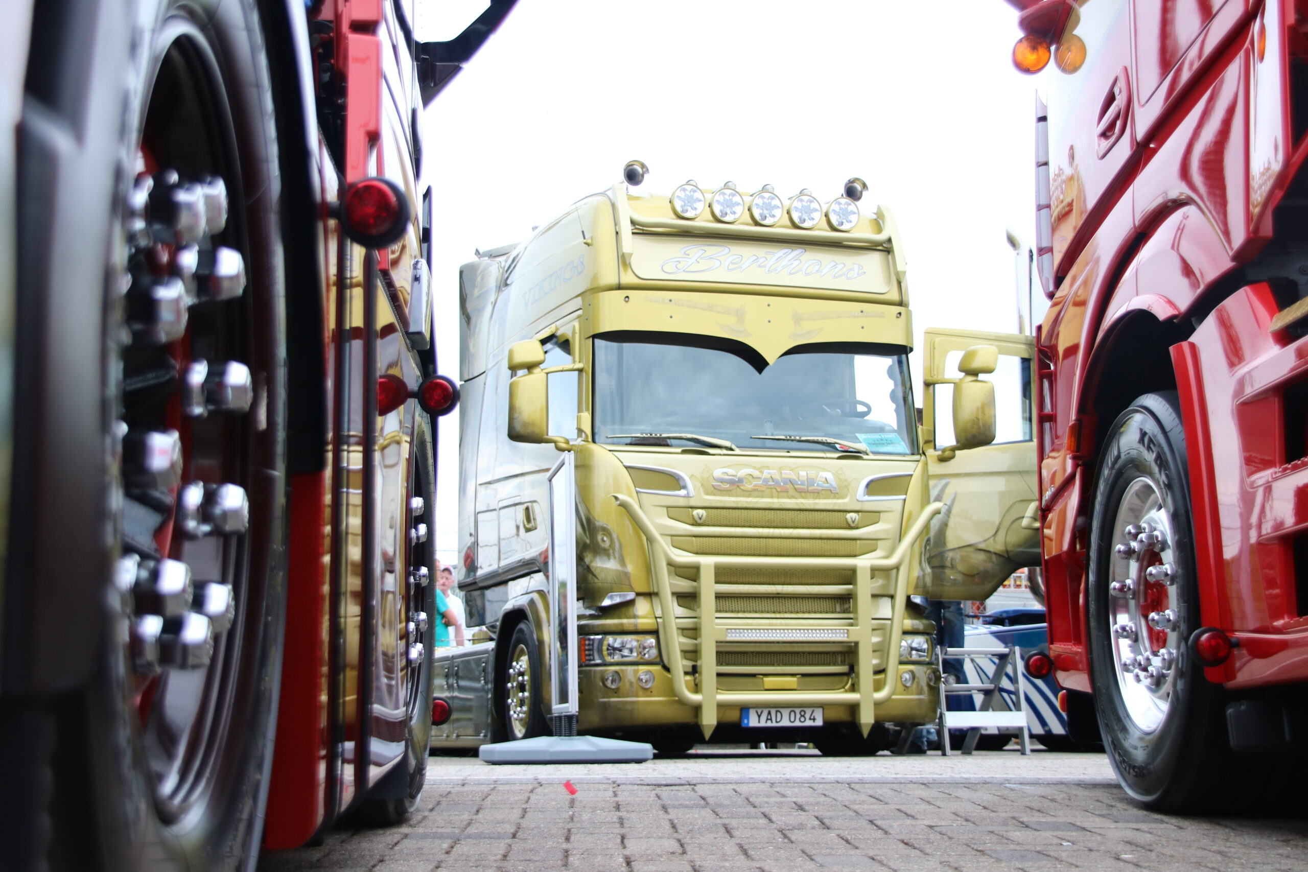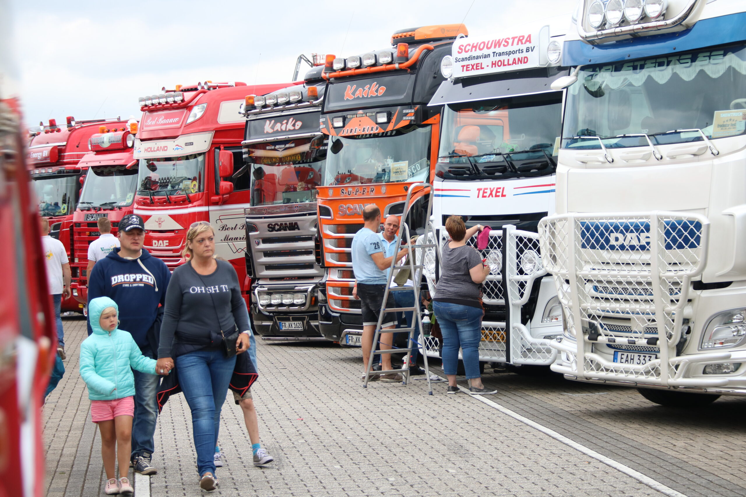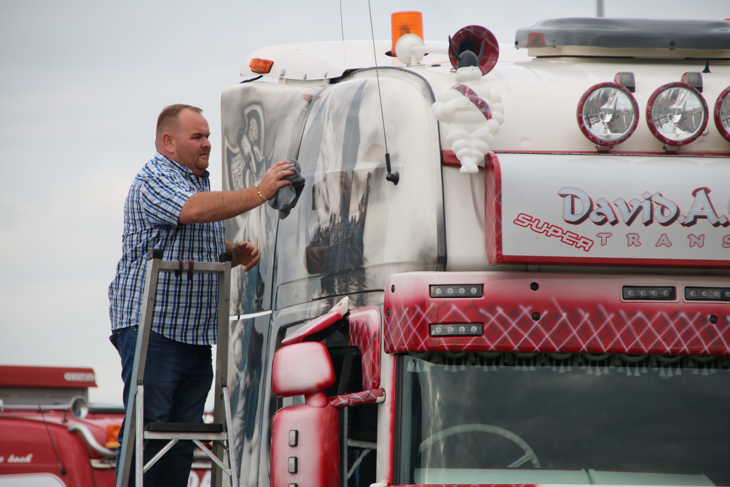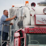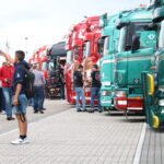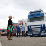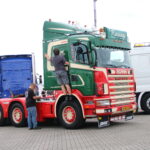 Verder is het vooral nog veel poetsen, bijstippen of zelfs bestickeren in de Showstraat! Loic Daems, chauffeur bij Ronny Ceusters, kijkt toe hoe zijn maat Jan Verachtert de hoekschilden van zijn Scania voorziet van logostickers. ,,Hij kan dit netter dan mij, dus moet hij het doen’’, lacht de Belg, die voor de derde keer met zijn truck een bezoek aan Assen brengt. Iets verderop staat Danny Rassing uit het Limburgse America. Hij kocht anderhalf jaar terug een ex-Deen die stapje voor stapje wordt gerestaureerd. Puur voor de hobby! Met hulp van vrienden brengt hij de 144L in showconditie. Mooi om te zien.