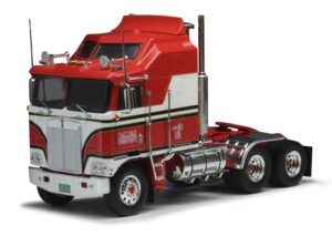 Nog zo’n fabrikant met een hele lijn bedrijfsauto’s in schaal 1:43 is Ixo. Hier bestaat het nieuws voornamelijk uit kleurvarianten van bijvoorbeeld de USA trucks die ook in de tijdschriftseries voorbij komen. Dat levert wel fraaie modellen op als de Kenworth K100 COE met aerodyne slaapcabine en de Freightliner FLA Cabover. De Peterbilt 359 is zo’n typische USA truck met veel chroom en lange neus. Hoewel hij er best klassiek uit ziet, wordt ie nog steeds nieuw geleverd al zijn de ronde koplampen inmiddels vervangen door vierkante. Wel klassiek is de Peterbilt 281 uit de jaren 50 met enkele koplampen en die ene luchthoorn in het midden.