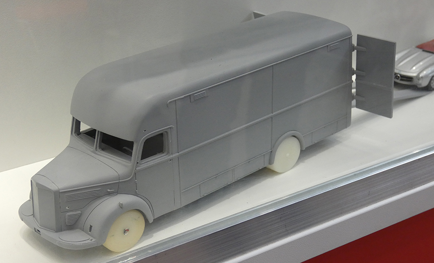 In een van de vitrines bij Schuco was deze autotransporter te zien. Nog een handmodel van een klassieke Mercedes waarmee vroeger de racewagens naar de circuits werden vervoerd.