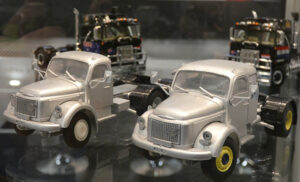 Deze Nederlandse fabrikant is het aantal vrachtwagens in schaal 1:32 lekker aan het uitbreiden. Na de Volvo FH en Mercedes Actros stonden er nu twee prototypes van een Scania NGS in de vitrine. Net als bij de andere trucks komt er een 4×2 trekker en een 6×2 met voorloopas. Marge kiest voor de R cabine met Highline dak. Ergens derde kwartaal van dit jaar zou hij op de markt moeten komen. Als vierde merk is een Renault T in ontwikkeling. Op het gebied van opleggers wordt er gewerkt aan een Knapen walking floor met echt afdekzeil. Ander nieuws is er in de vorm van een Nooteboom oplegger met of zonder dolly waar mooi de nieuwe vierassige zwaar transportvariant van de Volvo FH trekker voor past.