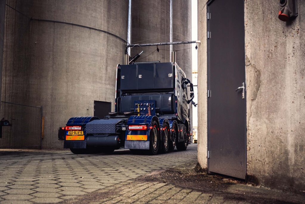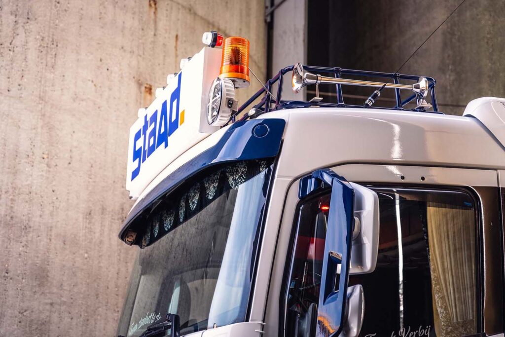 Nadat de Volvo FH 540 was aangekocht, onderging deze direct een complete metamorfose. Het voertuig werd volledig opnieuw gespoten, inclusief het chassis, in de Staad kleurstelling. De opbouw van de wagen werd uitgevoerd volgens de wensen van chauffeur en demonstrateur Frank Verbij, en werd verzorgd door de eigen monteur Jelle. Daarnaast werd het interieur volledig getransformeerd door Truck it Yourself. Er was behoefte aan voldoende werkverlichting voor de vroege ochtenden op locatie en het manoeuvreren in het donker. De nauwe samenwerking met verlichtingsexpert Jurgen van TRALERT® resulteerde in een perfecte afstemming van het verlichtingsontwerp op de behoeften van Staad, met een totaalplan voor optimale verlichting in alle omstandigheden.
