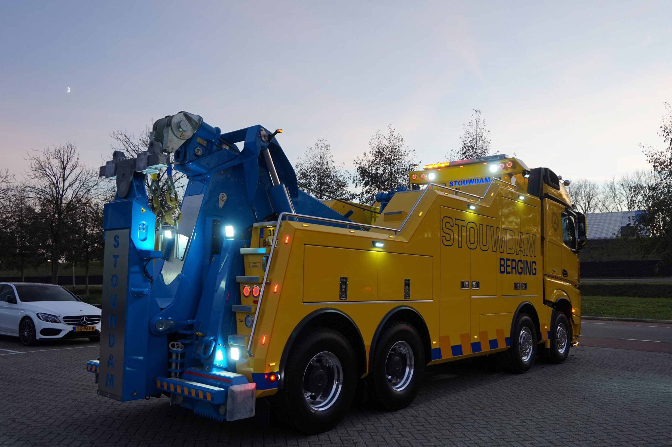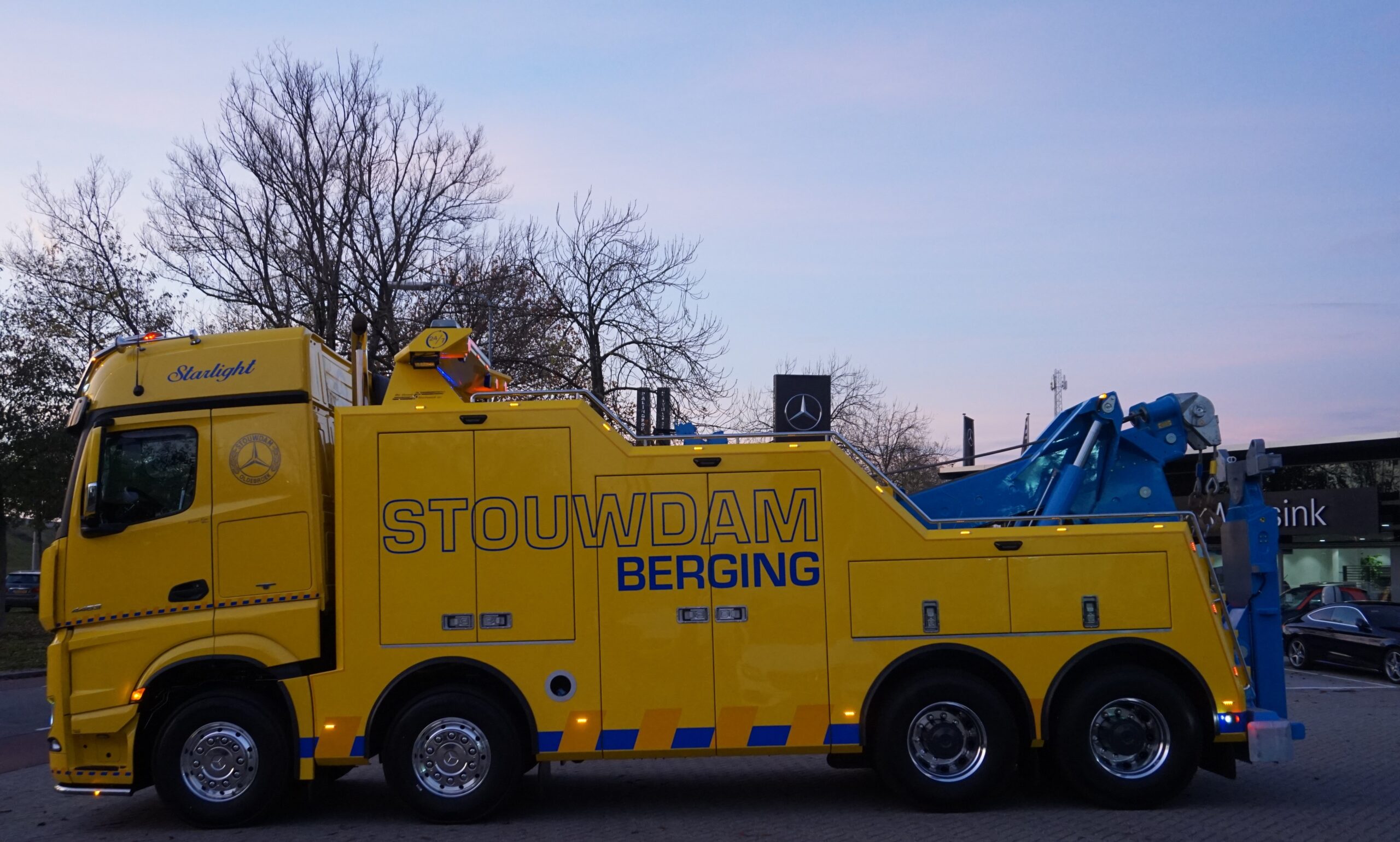 Voor het zware bergingswerk van vrachtwagens heeft Kraan- en Bergingsbedrijf Stouwdam uit Oldebroek bij Wensink Harderwijk een Arocs 4463 L 8×4 aangeschaft. Onder de cabine ligt de zwaarst leverbare krachtbron met 625 pk en 3.000 Nm. Om het bergingsvoertuig gemakkelijk in beweging te laten komen, zelfs bij zware belasting, is de Arocs voorzien van een Turbo-Retarder-Koppeling. De af-fabriek 13-tons luchtgeveerde achterassen kunnen extreem zware belasting aan. Toch laat de Arocs zich eenvoudig manoeuvreren dankzij de ServoTwin besturing. Tijdens het rangeren bij stilstand zorgen deze hydraulische servo-ondersteuning en de elektromotor voor verlichting. De BigSpace-Cabine is uitgerust met een Style-Line interieur en lederen bekleding.