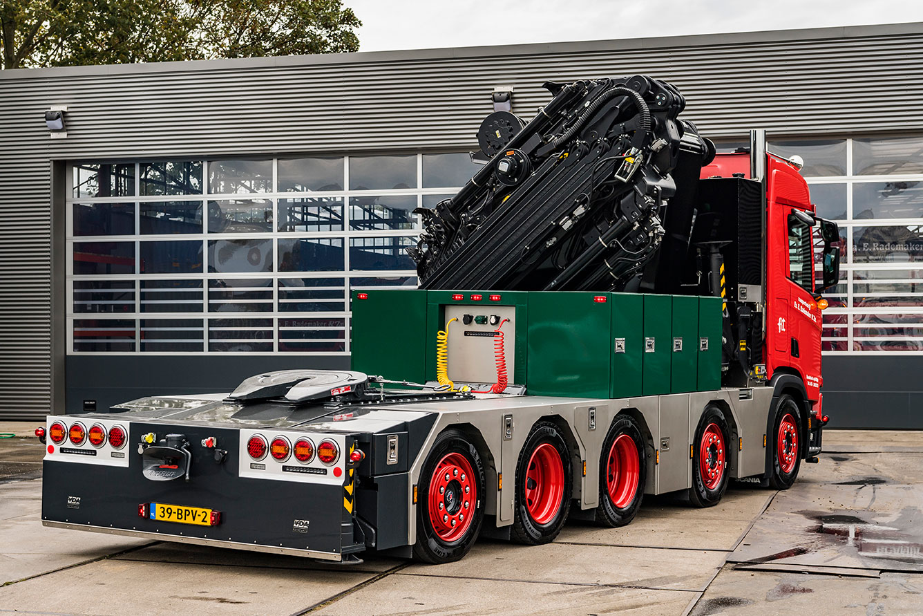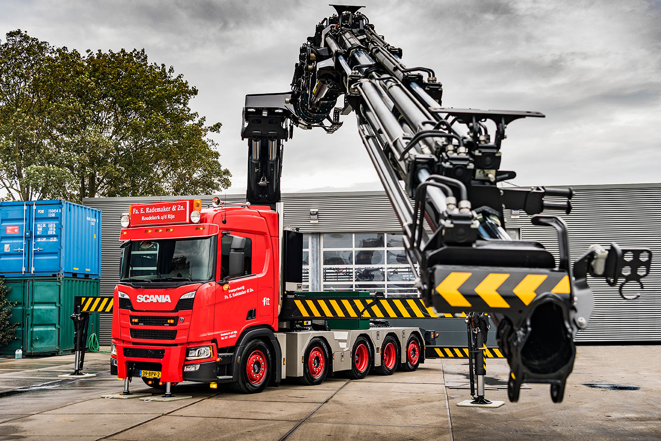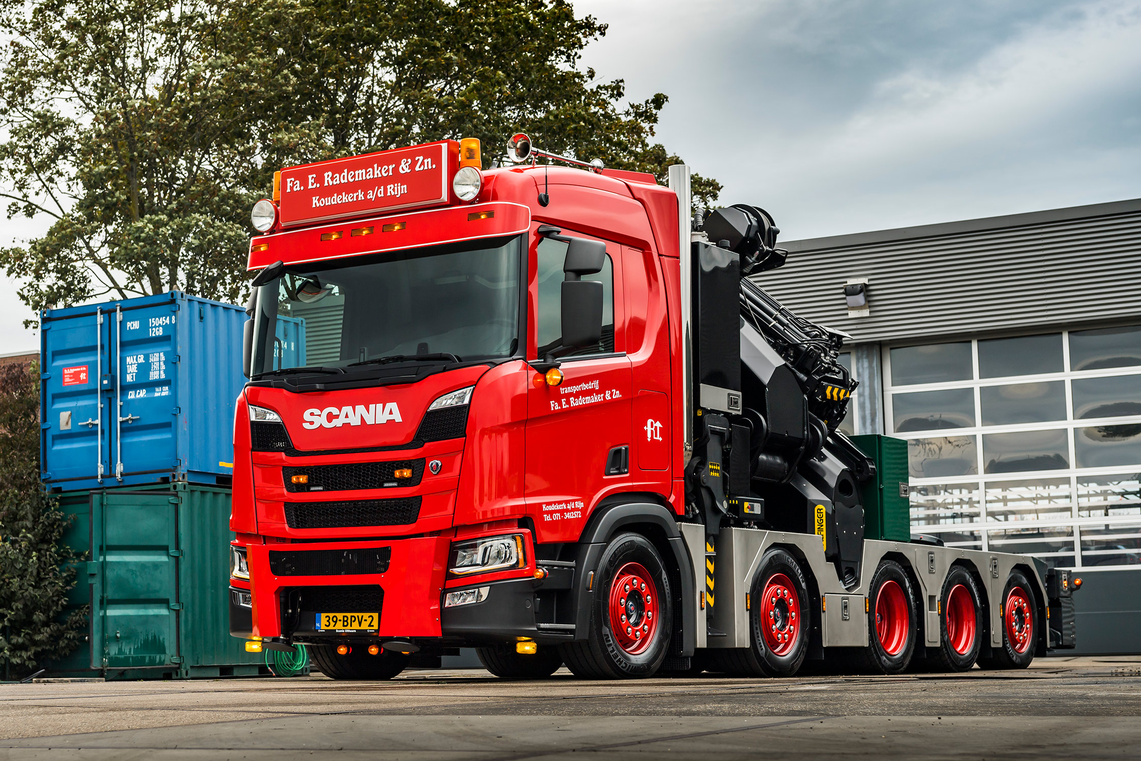 Rademaker Transport uit Koudekerk aan den Rijn rijdt sinds kort met een zeer bijzondere Scania R500 10×4 met een zes keer gestempelde 165 ton/m Palfinger kraan. Rademaker maakte de truck superwendbaar door het chassis met 30 centimeter in te korten met behoud van de 45 ton GVW.