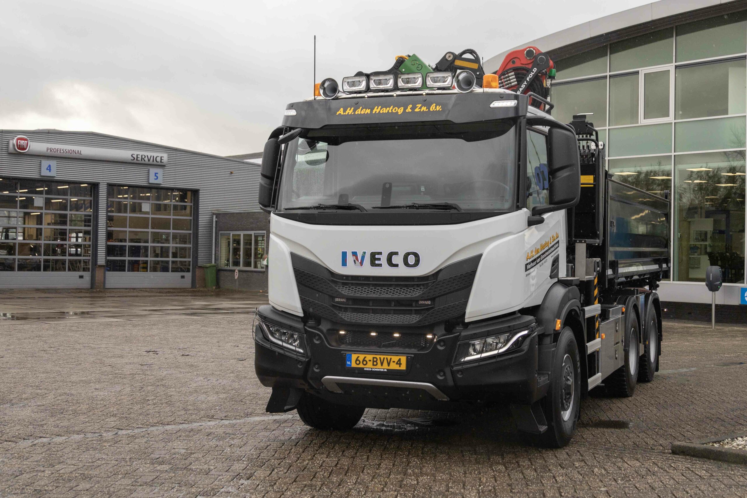 AH den Hartog & Zn heeft hun oude Iveco 6×6 Trakker vervangen door een nieuwe Iveco T-Way 6×4 met een 510pk Cursor 13 motor. De auto wordt ingezet voor verschillende projecten in de aannemerij. Het voertuig is als eerste Iveco in Nederland voorzien van het Veldhuizen Hydro WSG Widespread systeem.