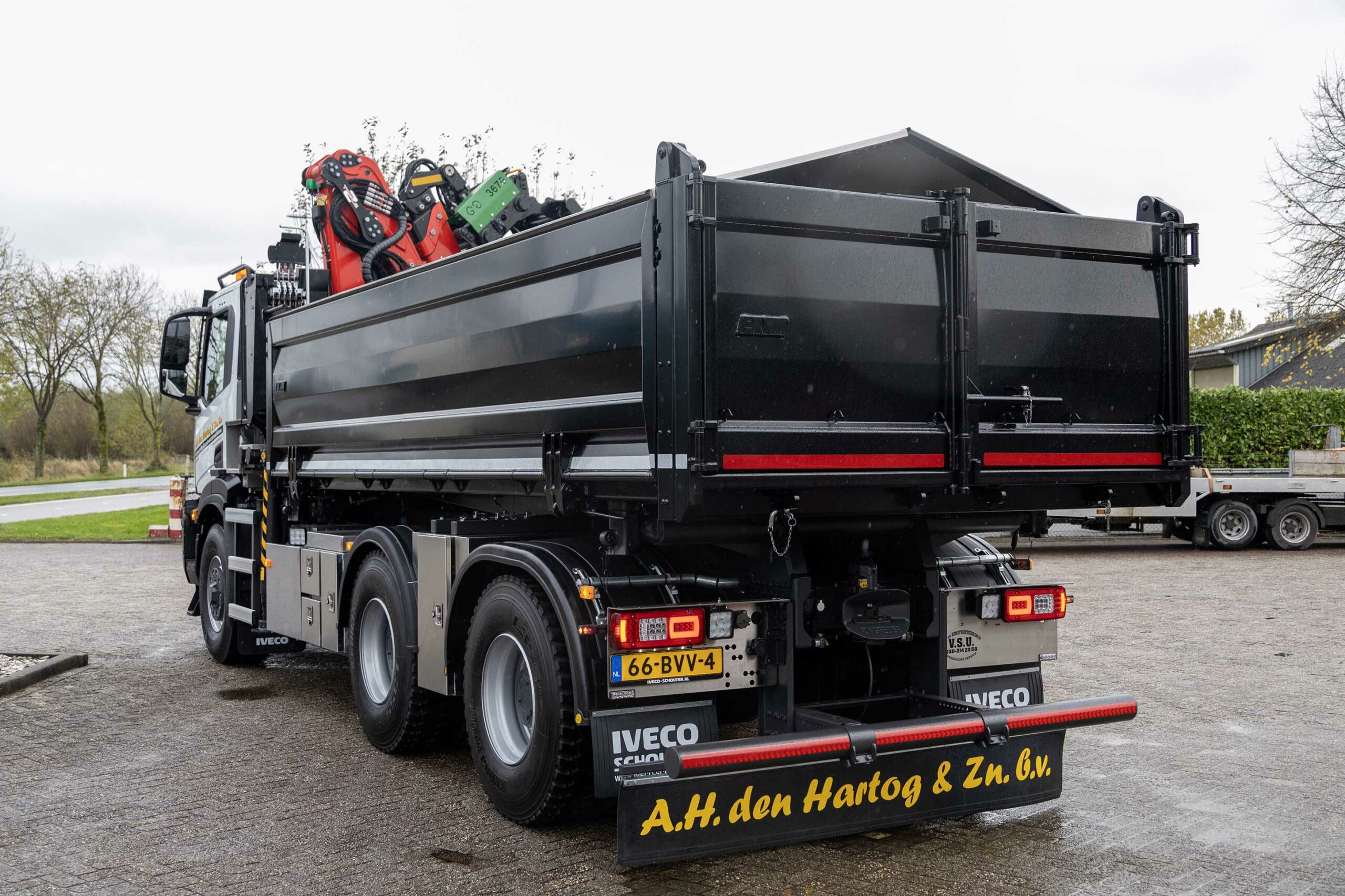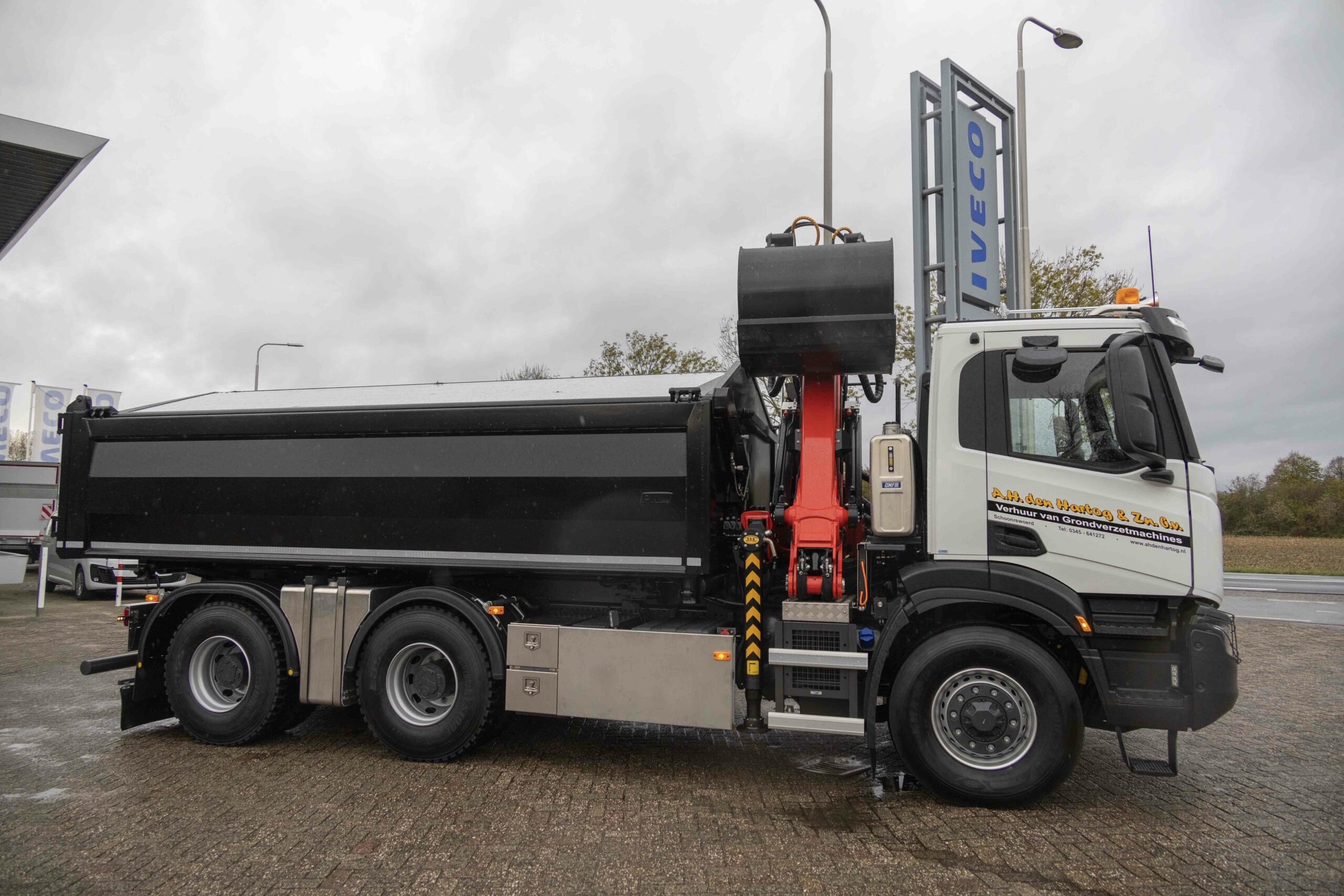 De Iveco T-Way is als eerste Iveco voertuig in Nederland voorzien van het Veldhuizen Hydro WSG Widespread systeem. Het systeem zorgt voor een hoger laadvermogen en maakt de auto nog wendbaarder. De achterste as van de T-Way stuurt tot 40km/h mee en het voertuig heeft een GVW van 33 ton. De opbouw van de kraan en kipper is verzorgd door Velis Scholten Utrecht. Met de alom bekende robuustheid van het Iveco chassis en alle bijbehorende componenten is deze T-Way het perfecte voertuig voor de off-road missies van AH den Hartog & Zn.