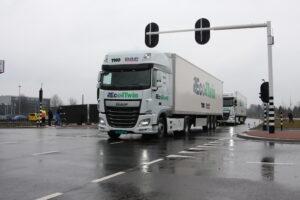 DAF en TNO in 'platooning'-demonstratie DAF en TNO hebben een zogeheten 'platooning'-demonstratie gegeven onder de naam EcoTwin.