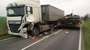 Tank ramt truck Tijdens een proefrit in het Oost-Duitse Woldegk werd een vrachtwagen geramd door een Leopard tank.