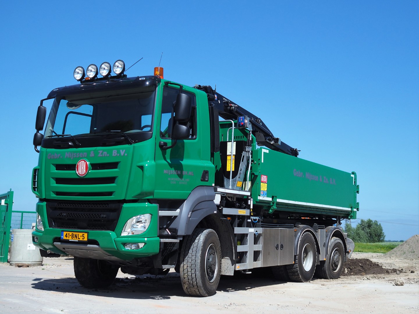 “Na enig online zoekwerk kwamen we bij Tatra uit en zijn we ons gaan oriënteren. Tijdens de TKD kwamen we in contact met Gerrit van der Garde van Tatra Nederland. Wanneer je met hem over een bouwvoertuig spreekt, vallen vele anderen in het niet. Gerrit heeft alle specifieke kennis over waar een bouwvoertuig aan moet voldoen en kan ook heel specifiek adviseren”, aldus Jaap Nijssen. “Dat praat voor ons ook een stuk makkelijker. Hij begreep echt precies wat wij bedoelden en zochten. De op de TKD gedemonstreerde 6×6 bleek technisch gezien aan alle wensen te voldoen. Alleen wilden wij een iets andere kipper en een voor de bak gemonteerde HMF Z kraan op de auto. Dat bleek geen probleem. Via onze vaste leverancier HSW in Weesp kon de auto exact naar wens opgebouwd worden tot wat het nu is. Een auto waar we echt al onze transporttaken mee kunnen verrichten. Op locatie laden en lossen van vrachten en hij is ook prima in staat om onze diepladers met machines van en naar de werken te rijden.”