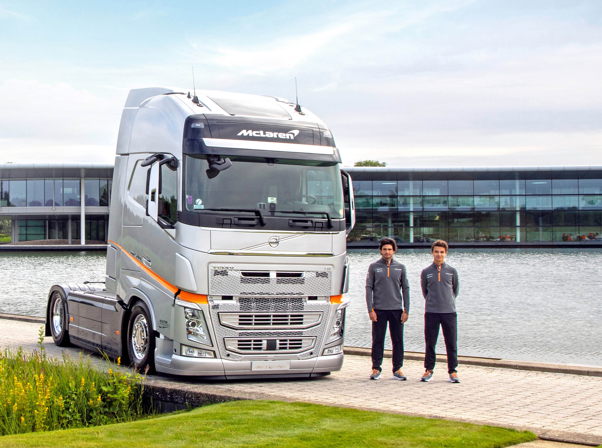 - Huidige F1-coureurs Carlos Sainz en Lando Norris poseren met een Volvo FH voor het McLaren Technology Centre.