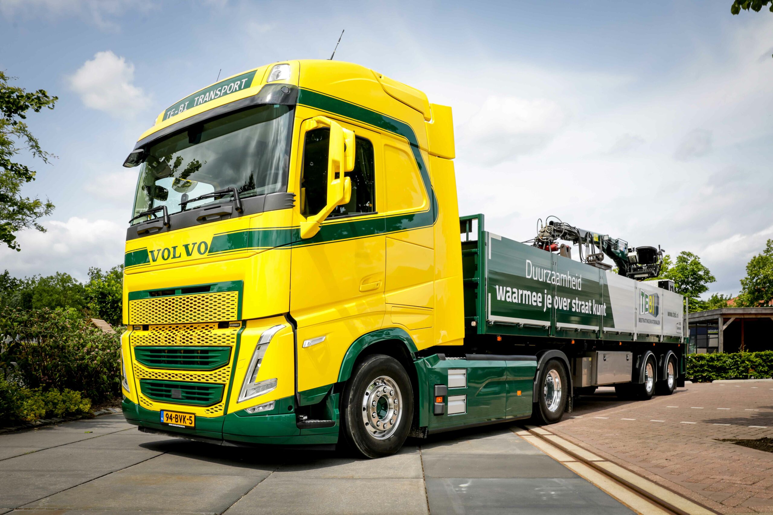 Achter de nieuwe, in het kenmerkende Tebi-groen en geel gespoten, Volvo FH Electric hangt een trailer met elektrische laadkraan. “Dit zodat we duurzaam kunnen laden en lossen bij klanten. De trailer is twee-assig met twee gestuurde assen zodat we in woonwijken en in steden makkelijk kunnen manoeuvreren.”