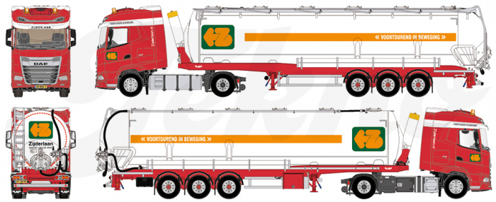 De eerste nieuwe LAG silotrailer komt uit in de kleuren van transportbedrijf Zijderlaan en zal achter een DAF XG gekoppeld zijn. Het model is te reserveren via de website van Tekno.