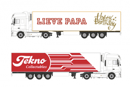 Onder het motto ‘You invent. We make it roll.’ biedt Tekno verzamelaars en zakelijke klanten de mogelijkheid om een DAF of Scania 1:87 oplegger naar eigen ontwerp te laten bedrukken. Alle remmen mogen los, want de truck designer maakt het mogelijk om eigen foto’s, tekst in een eindeloos aantal kleuren en symbolen in te voegen.