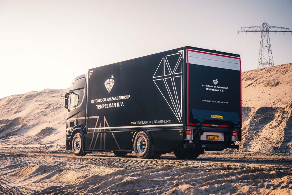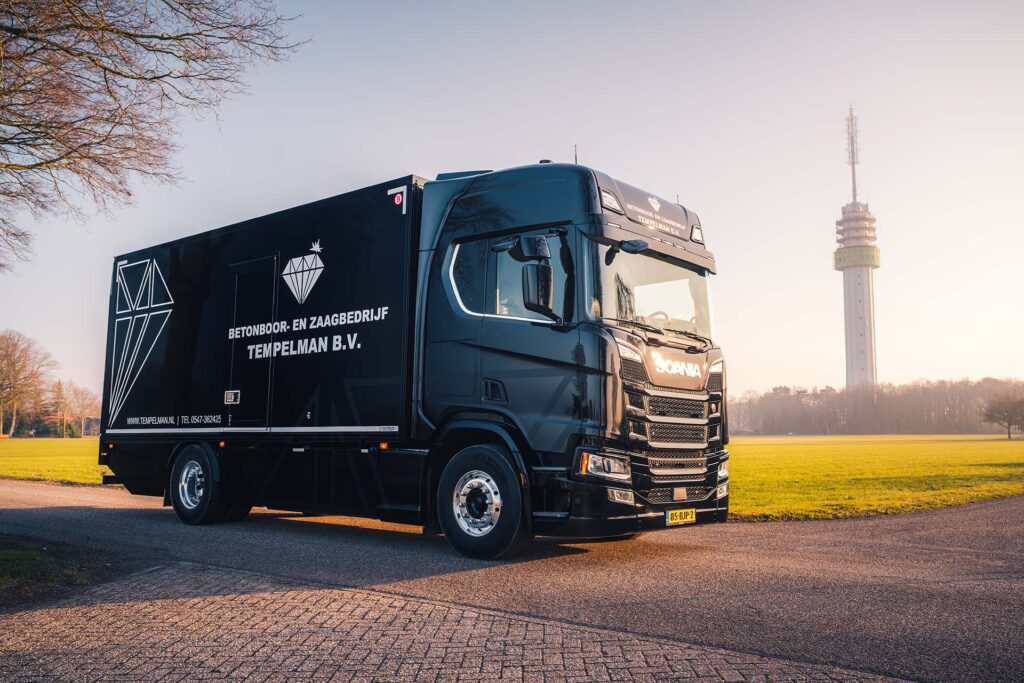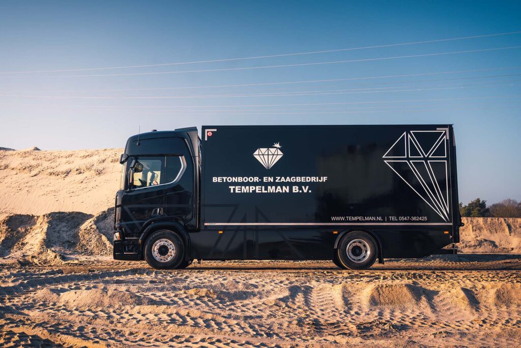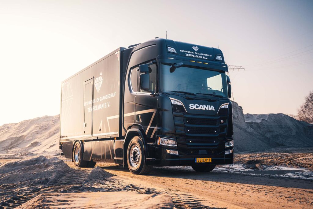 Het derde generatie familiebedrijf uit Markelo is gespecialiseerd in het boren, zagen en frezen van beton en steenachtige materialen met diamantgereedschap. Om het zware materieel veilig over te brengen naar de werklocaties, is deze Scania uit 2017 toegevoegd aan het wagenpark.