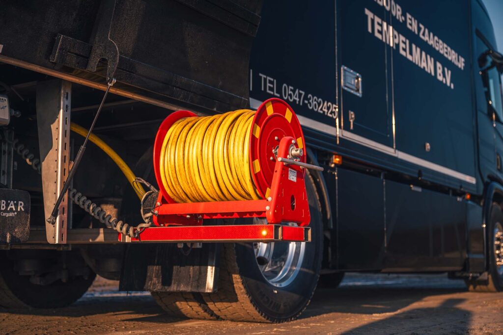Een belangrijk onderdeel van de werkzaamheden van Tempelman B.V. vindt plaats op het asfalt van de openbare weg. Daarom koos men voor Van Berkum Carrosseriebedrijf. De opbouw vergroot zowel de veiligheid voor werknemers als de zichtbaarheid van de truck.