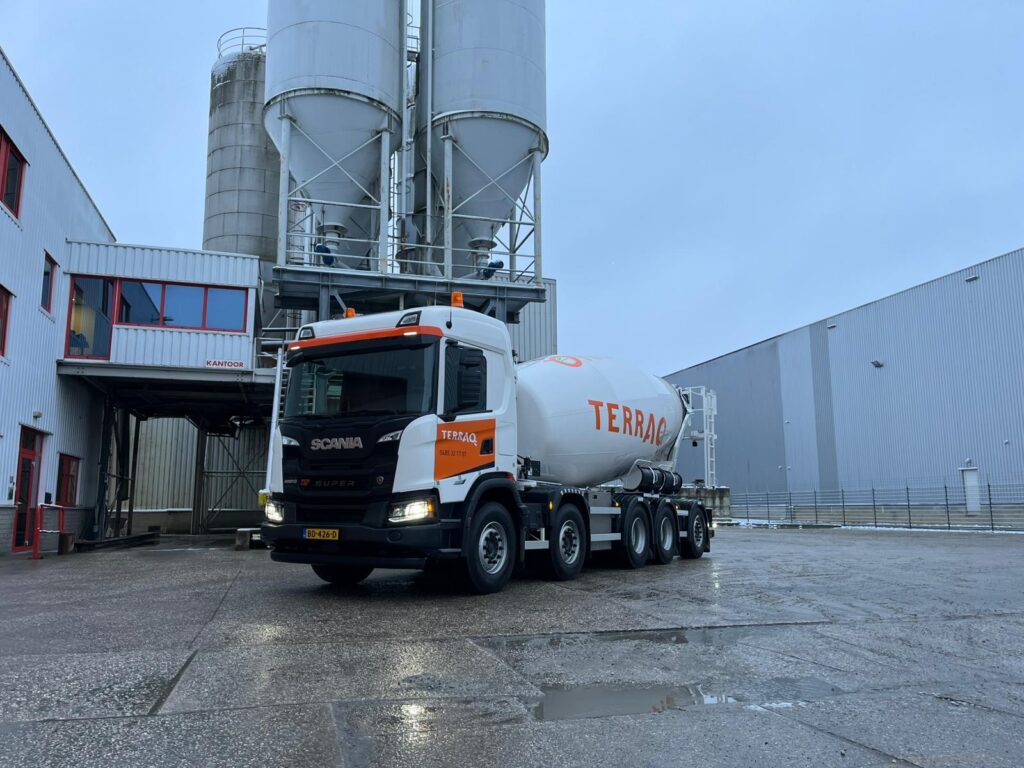 Terraq uit Cuijk heeft een nieuwe Scania 460G B 10×4*6 XT betonmixer in gebruik genomen. De vijfassige truck is af-fabriek geleverd met de Wide Spread Triple-asconfiguratie, waarmee een wettelijk toegestaan totaalgewicht van 49 ton mogelijk is. Voor Terraq was juist deze af-fabriek oplossing een doorslaggevende factor in de keuze voor Scania.