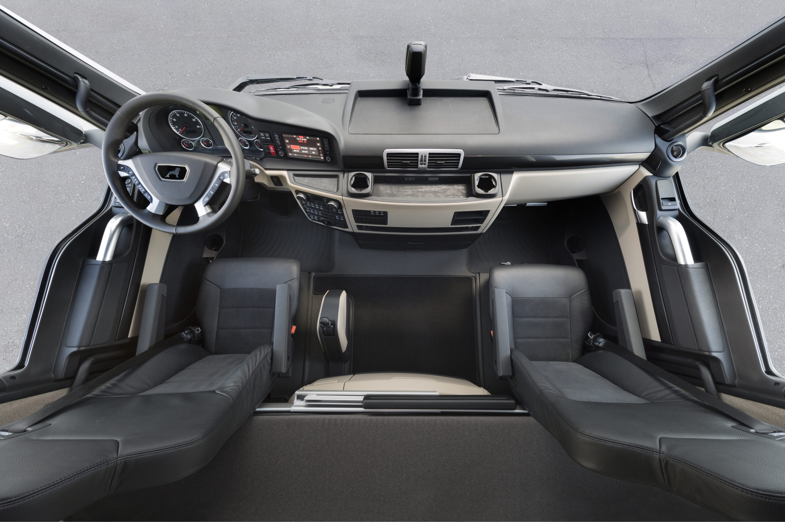 Het moet gezegd: de cabine is er een stuk plezieriger op geworden. Op het instrumentenpaneel valt het nieuwe 4 inch hi-res kleurenscherm op. Dit werkt samen met het infotainmentsysteem MMT en maakt gebruik van iconen in diverse kleuren. De lange L, LX, XLX en XXL slaapcabine-uitvoeringen van de MAN TGX- en TGS-modellen bieden nu meer (opberg)ruimte. Daarnaast is er nu een uitschuifbare koelkast leverbaar. Deze kan onder het bed worden opgeborgen. In het rust-/slaapgedeelte bevindt zich een controlepaneel met LCD-display. Hiermee zijn de interieurverlichting, ramen en het schuifdak te bedienen. Ook een wekalarm en 12V-, 24V- en USB-aansluitingen zijn inbegrepen. Dat betekent dat het gebruikt kan worden met smartphones, tablets en televisies. Nieuw voor de TGX-serie is het zogenoemde acoustic package. De extra isolatie zorgt volgens MAN voor een beduidend lager geluidsniveau in de cabine.