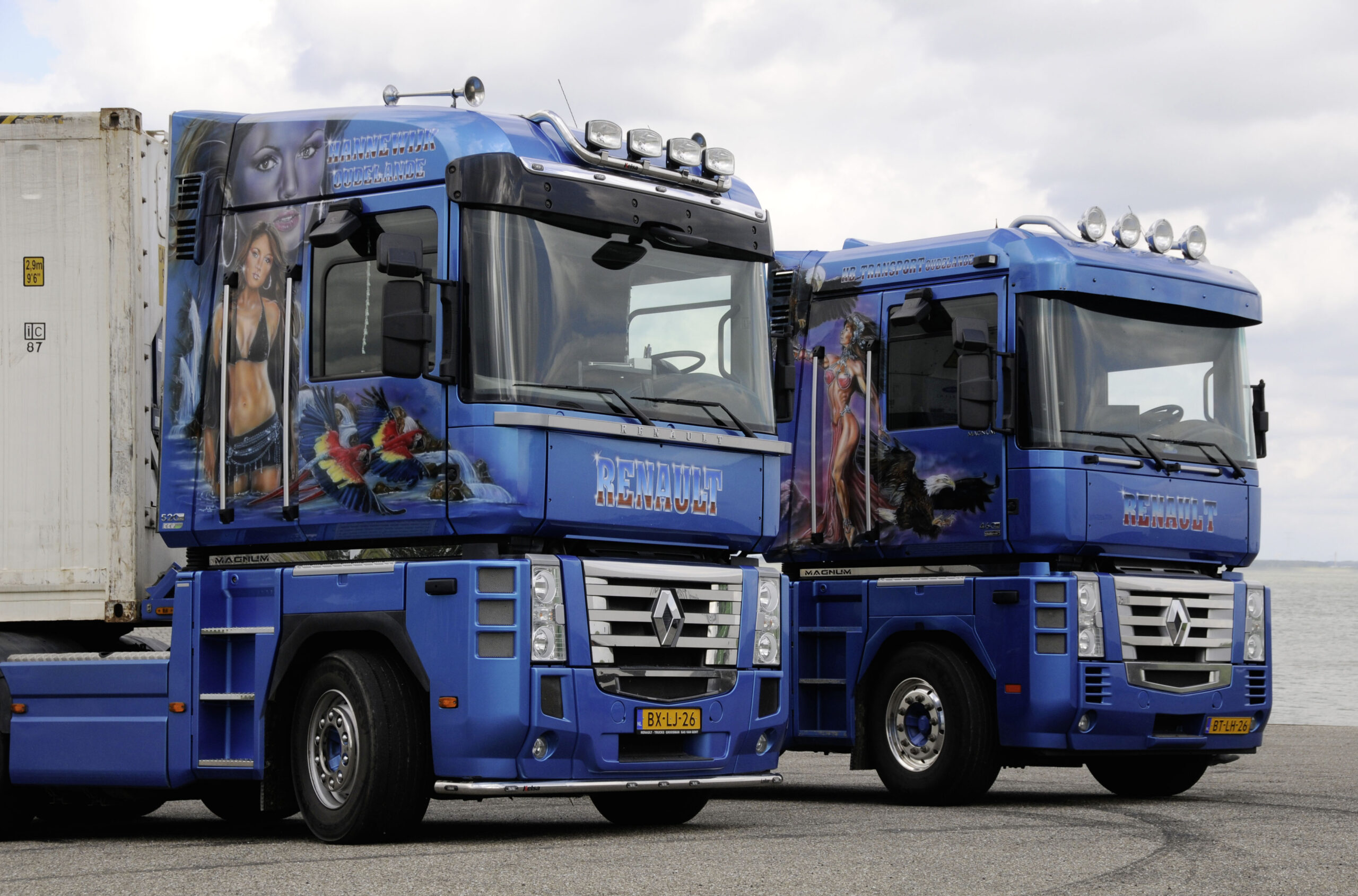 Zijn schoonzoon lacht: “Er hebben al heel wat schoonheden op de wagens gestaan. Meestal naamloze modellen uit een plaatjesboek, maar ook een keer Blondie en Cher.” Verder prijkten er zeemeerminnen, roofvogels en tijgers op de dikke Renaults. Al het airbrushwerk is altijd in overleg met Wil van der Ouderaa gedaan. De cabine van een Magnum is volgens de mannen niet echt gemakkelijk te beschilderen. Harold: “Dat komt door de lange handrails op de zijkant. Daar moet je echt rekening mee houden, want je wilt natuurlijk niet dat het halve gezicht van Shakira er achter wegvalt.”
