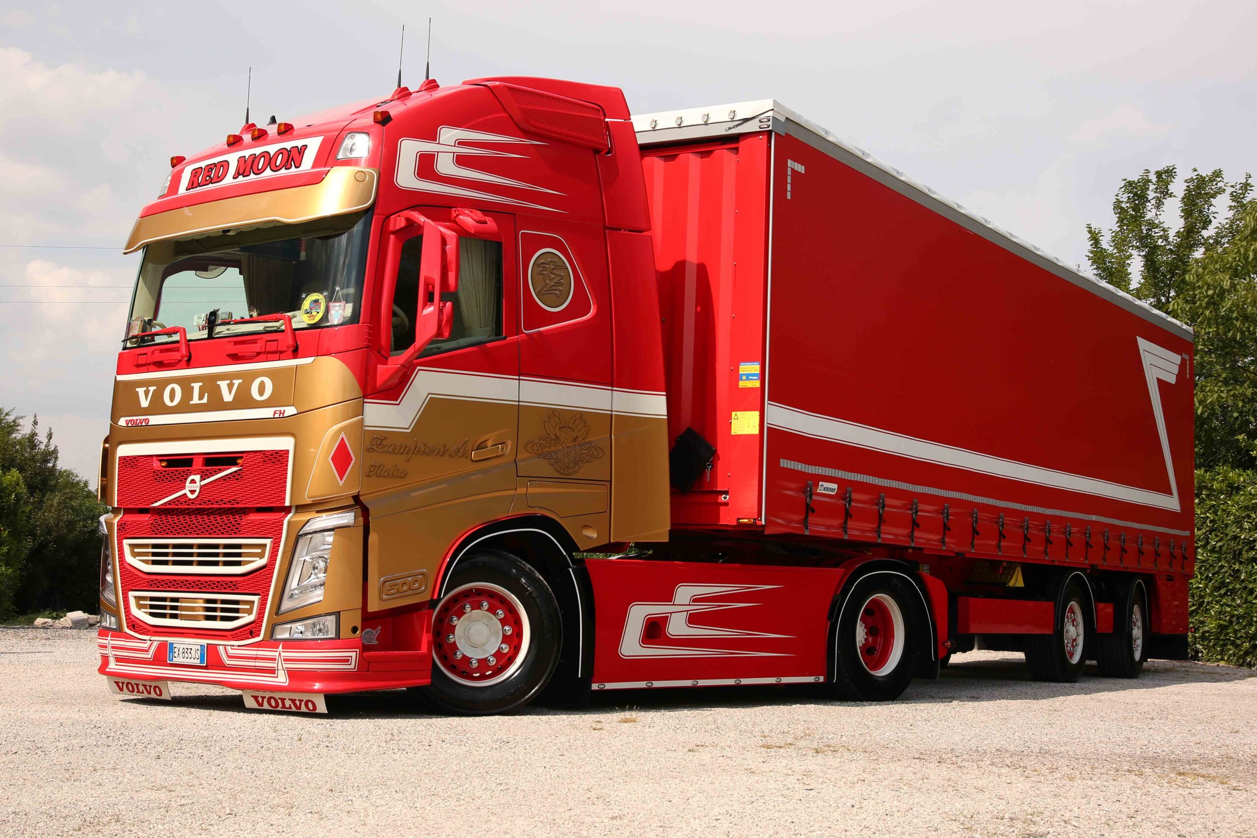 Naast de Scania 4-serie van Tiziano Zampieri staat de Volvo FH uit 2015 van broer Adriano Zampieri te pronken. Hij vervoert al jaren koffie door heel Italië: eerst met een witte Volvo bakwagen, maar toen de vrachten groter worden met een trekker-oplegger. Net als Tiziano is hij zeer gecharmeerd van Zweedse trucks, maar dan van dat andere merk. Zodoende kwam er een Volvo FH Globetrotter XL met 500 pk-motor. Geheel in stijl met de truck van zijn broer wordt het chassis dichtgebouwd en de opbouw in rood-met-goud en witte details uitgevoerd. Zo zijn er witte strepen gespoten over de bumper en onderlip. In de flanken van de cabine is de werkverlichting subtiel weggewerkt. De bedrijfsnaam en een Viking-beeldmerk zijn met schaduwlijnen op de deuren gespoten. De rode, tweeassige schuifzeilenoplegger is ook aangepakt, met doorlopende striping en een immens Vikingschip op de beide achterdeuren.
