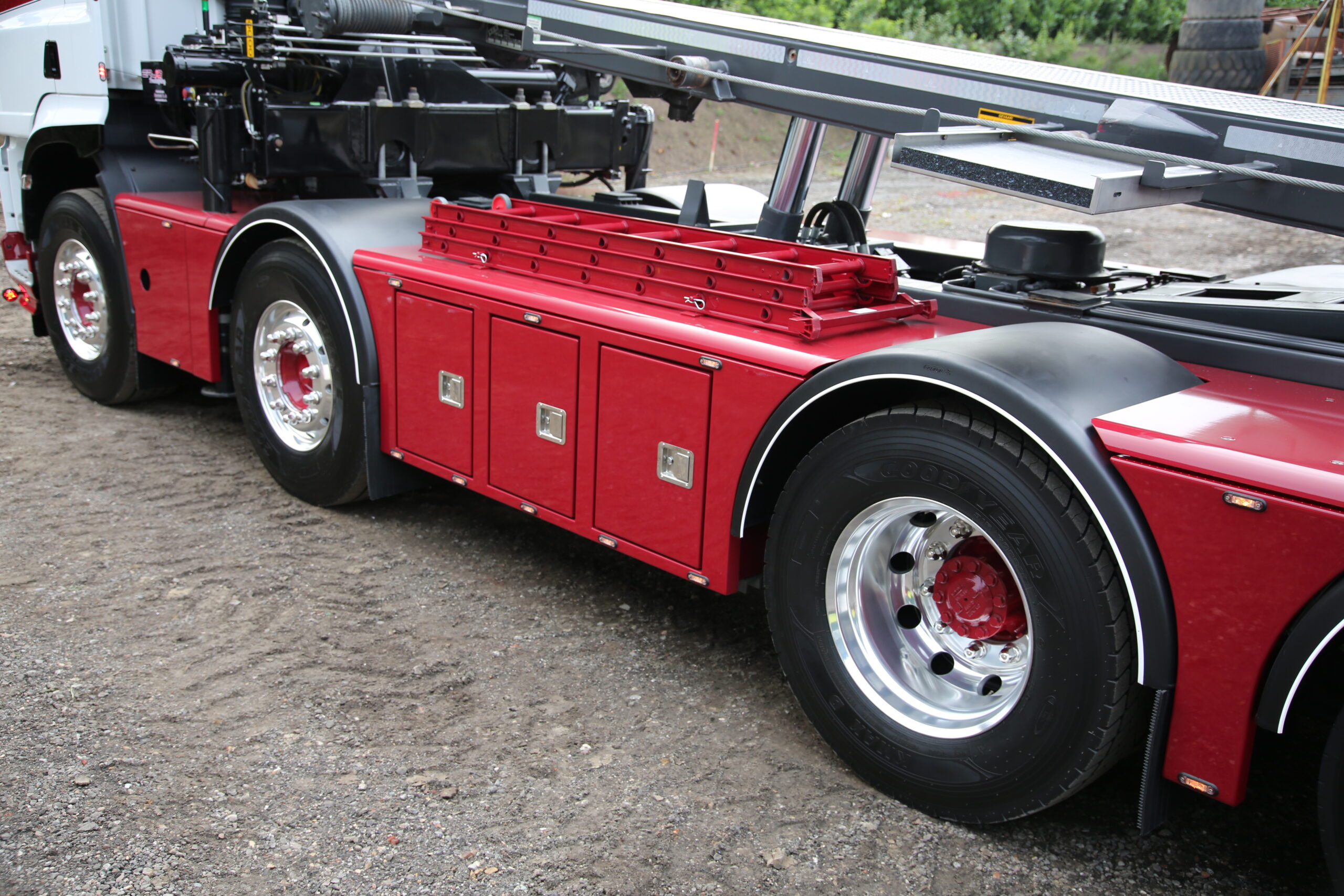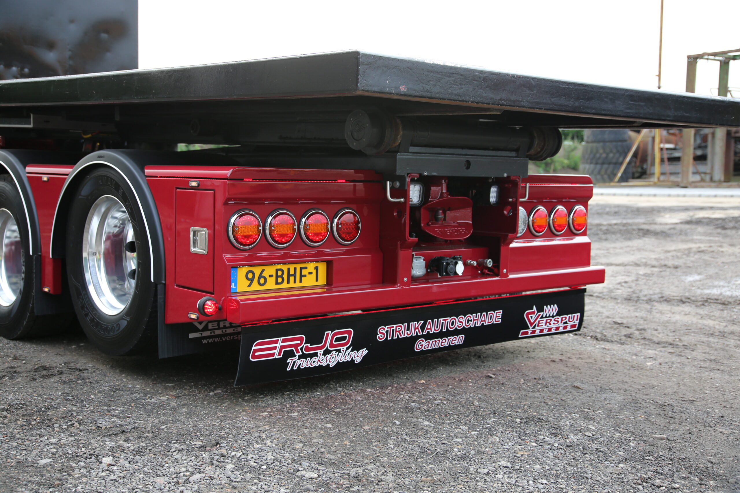 Dat de opbouw van de bakwagen zo geworden is heeft te maken met de buurman van Niels: Erjo truckstyling. “In overleg met Erwin zijn we tot dit resultaat gekomen omdat ik het chassis aan de zij- en bovenkant tegen het kabelsysteem aan dichtgemaakt wilde hebben.” Tussen de zijplaat en de plaat boven op het chassis naar het kabelsysteem is een kleine kier te zien. “Met opzet,” zegt Niels. “Daar achter zit een ledstrip, die zorgt voor een rode gloed rond de auto wanneer het donker is.” Ook van de steunpoten van de 22 t-m HMF kraan is iets bijzonders gemaakt. In ingevouwen staat is er niks te zien, maar bij het uitzetten van de stempels komt er een deel van de zijafscherming mee naar buiten. Ook voor het opbergen van het hijs- en spanmateriaal zijn grote kisten gemaakt. Functioneel en mooi.