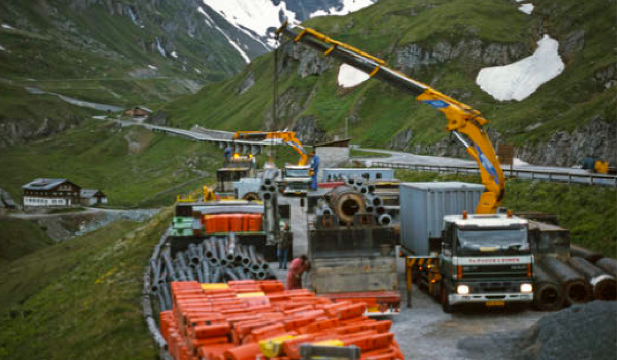 Na aankomst op de Franz­ Josefs-Höhe, onderweg naar de Grossglockner, om tien uur ‘s avonds wordt besloten een aantal auto’s nog te lossen. Zij moeten morgen in Duitsland terugladen. Op een hoogte van 2.200 meter worden de pontons, machines en andere onderdelen op een verlaten parkeerterrein gezet. Dat gebeurt met behulp van de 45 ton-meter Effer-autolaad­kraan op de DAF 85.330 6×4-bakwagen van Jan Korevaar. Deze trucks zullen samen met de door Dirk Blokland bestuurde DAF 75CF de komende dagen ook zorg­dragen voor het verdere trans­port van al het materieel van de parkeerplaats naar de 1,5 kilo­meter verderop gelegen oever van het stuwmeer. Een klus die het uiterste zal vragen van mens en machine. Het meertje is na­melijk veel lager gelegen dan de Franz Josefs-Höhe. Het ma­terieel moet hier omlaag wor­den gebracht over een zeer steil, smal weggetje, dat nog het beste met de term ‘geitenpad’ kan worden aangeduid.