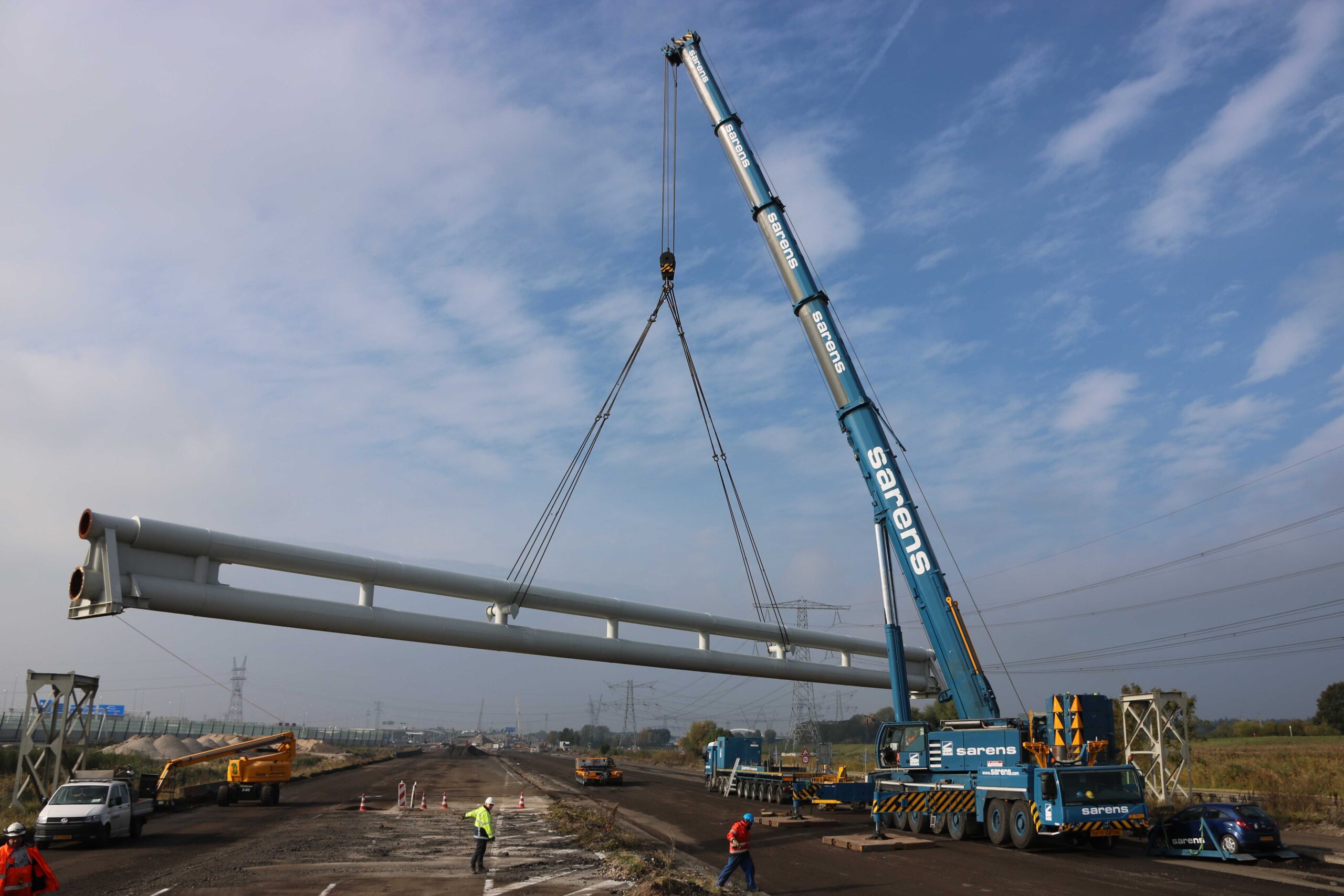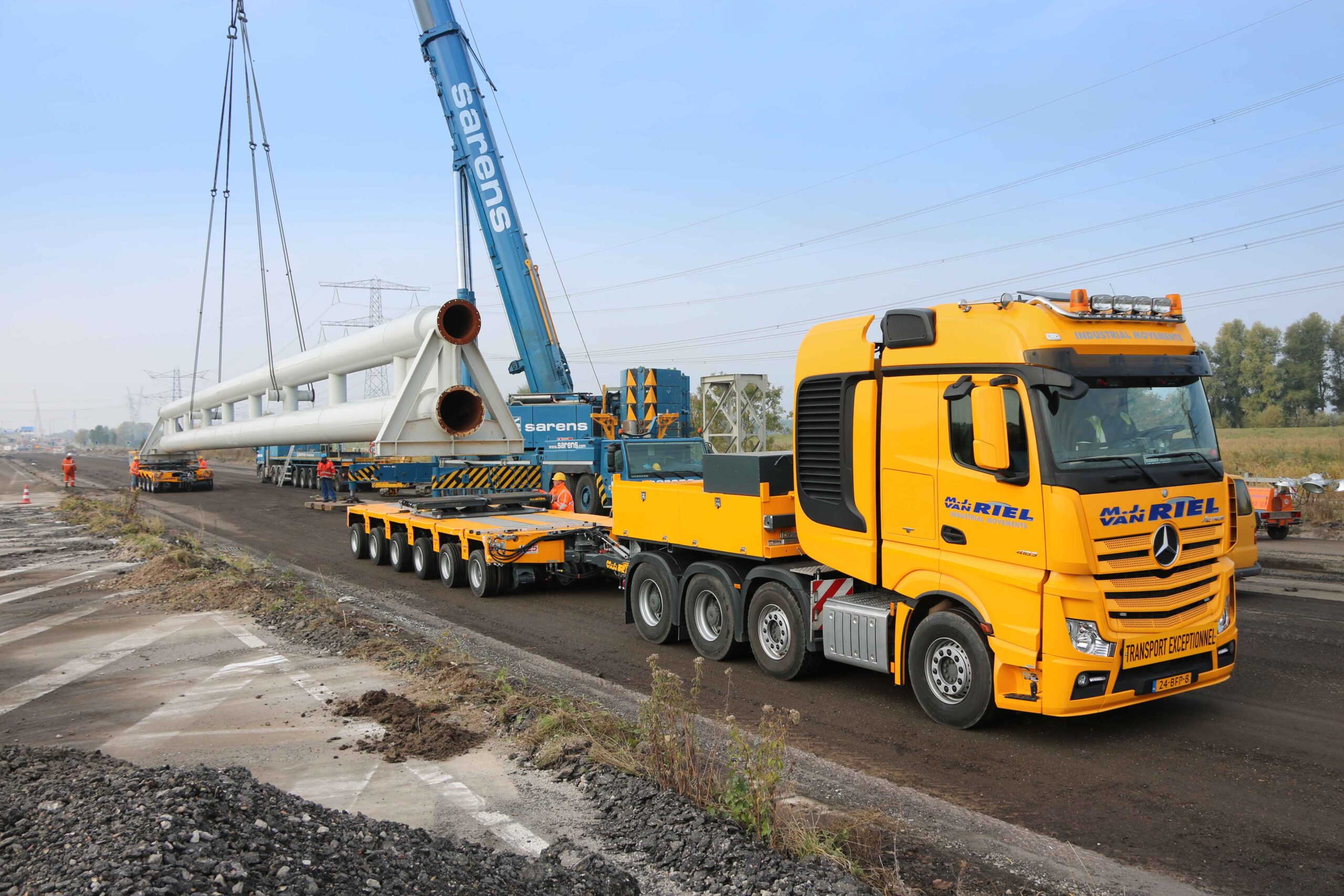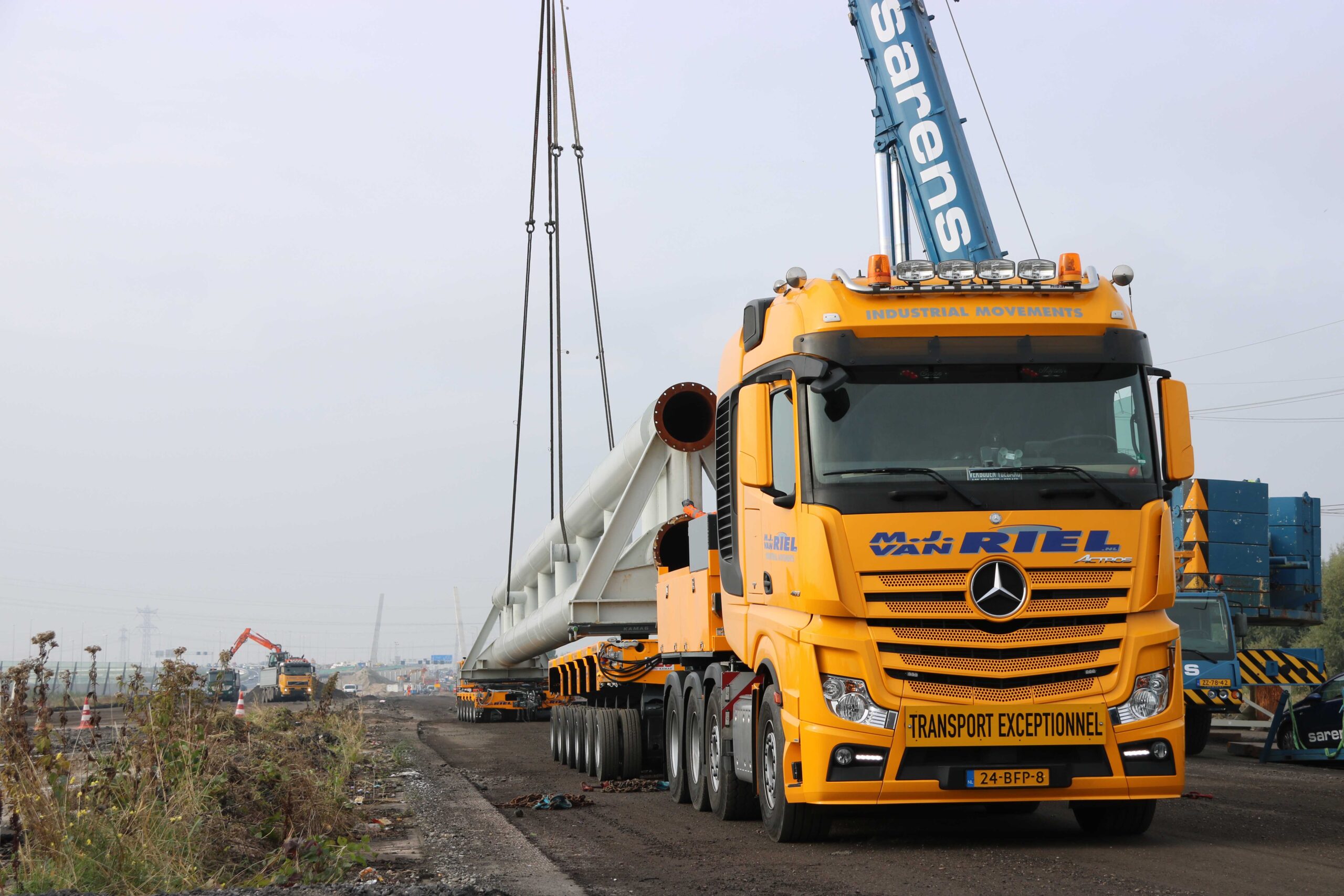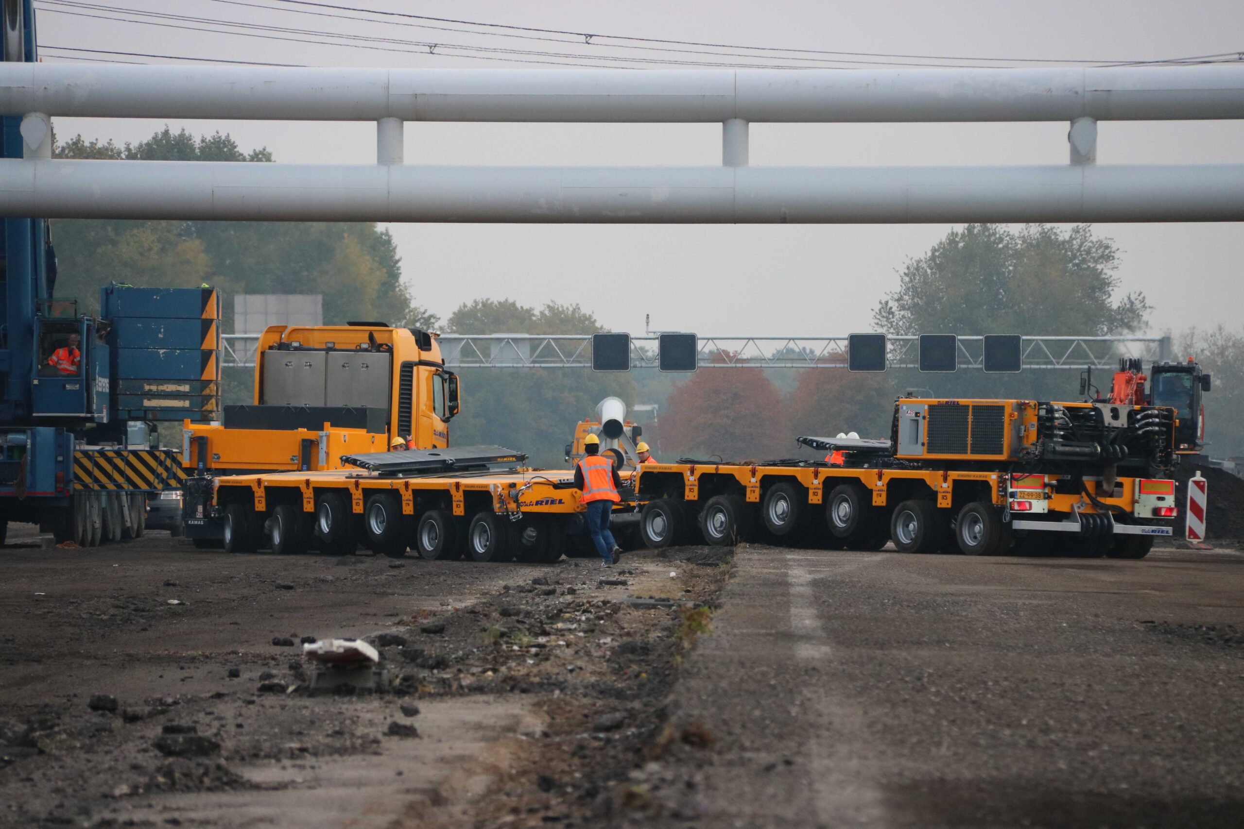 Bart Coppens (36) rijdt zijn Mercedes Actros een bouwplaats op vlak bij Muiden. De nog verse modulaire platformwagens van Scheuerle Kamag rollen stapvoets achter hem aan. Met deze modules wordt vandaag wederom een stuk van het oude gedeelte van snelweg A1 ontmanteld. Coppens rijdt onder de immens grote leidingbrug door en zoekt een geschikte plek om zijn combinatie te draaien. De voormalige rijbaan is getransformeerd tot een bouwplaats waar vrachtwagens af en aan rijden om gemalen asfalt en ander puin te ruimen. Dat is hier dagelijkse kost, maar een leidingbrug van 42 meter lang en 82 ton zwaar is toch andere koek.